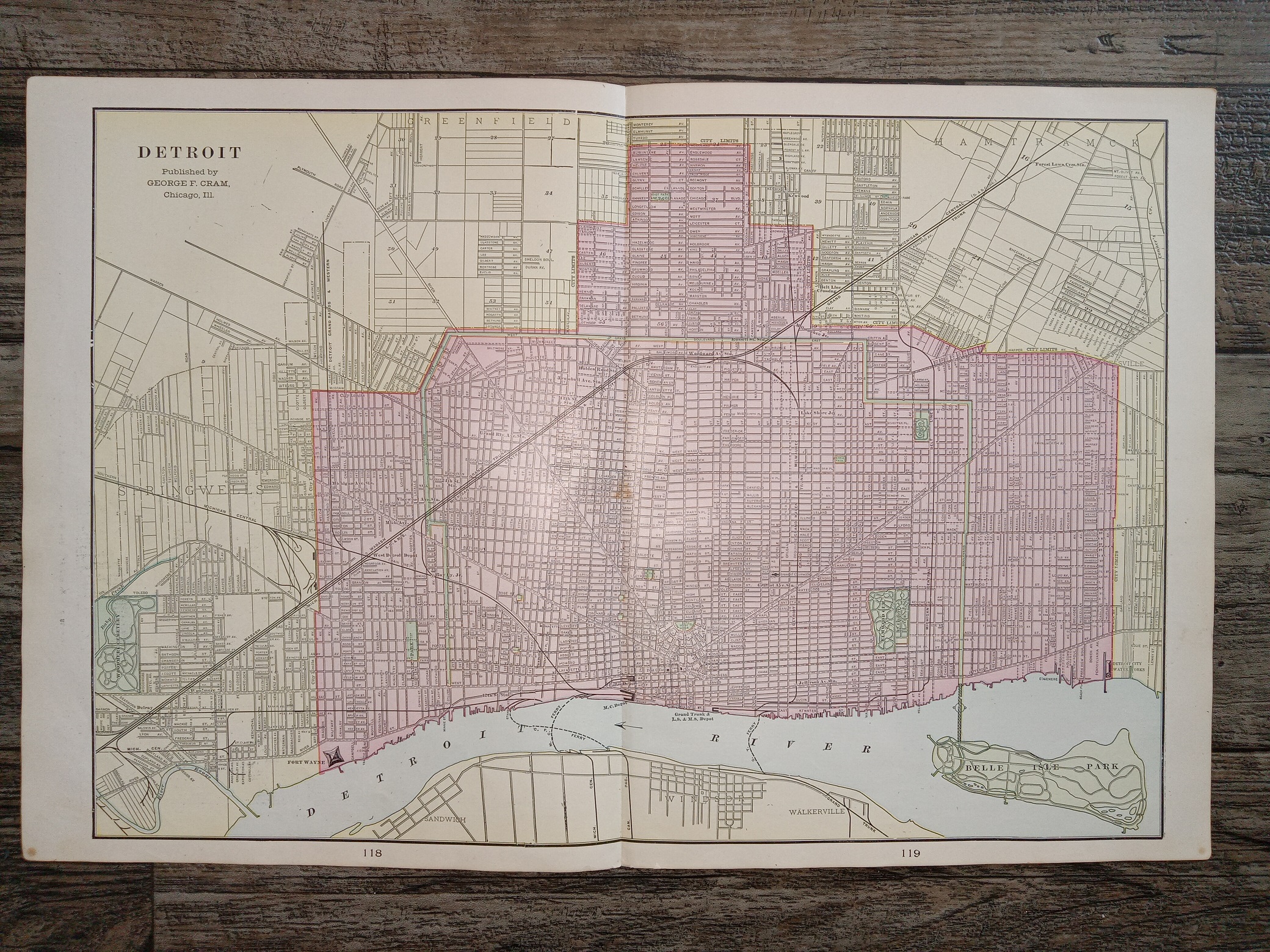 Map taken from a large, old atlas, 22 inches tall; 14 inches wide. Folded in half; good condition. The map has some small stains, the edges have some tears, and there’s a little writing in pencil.