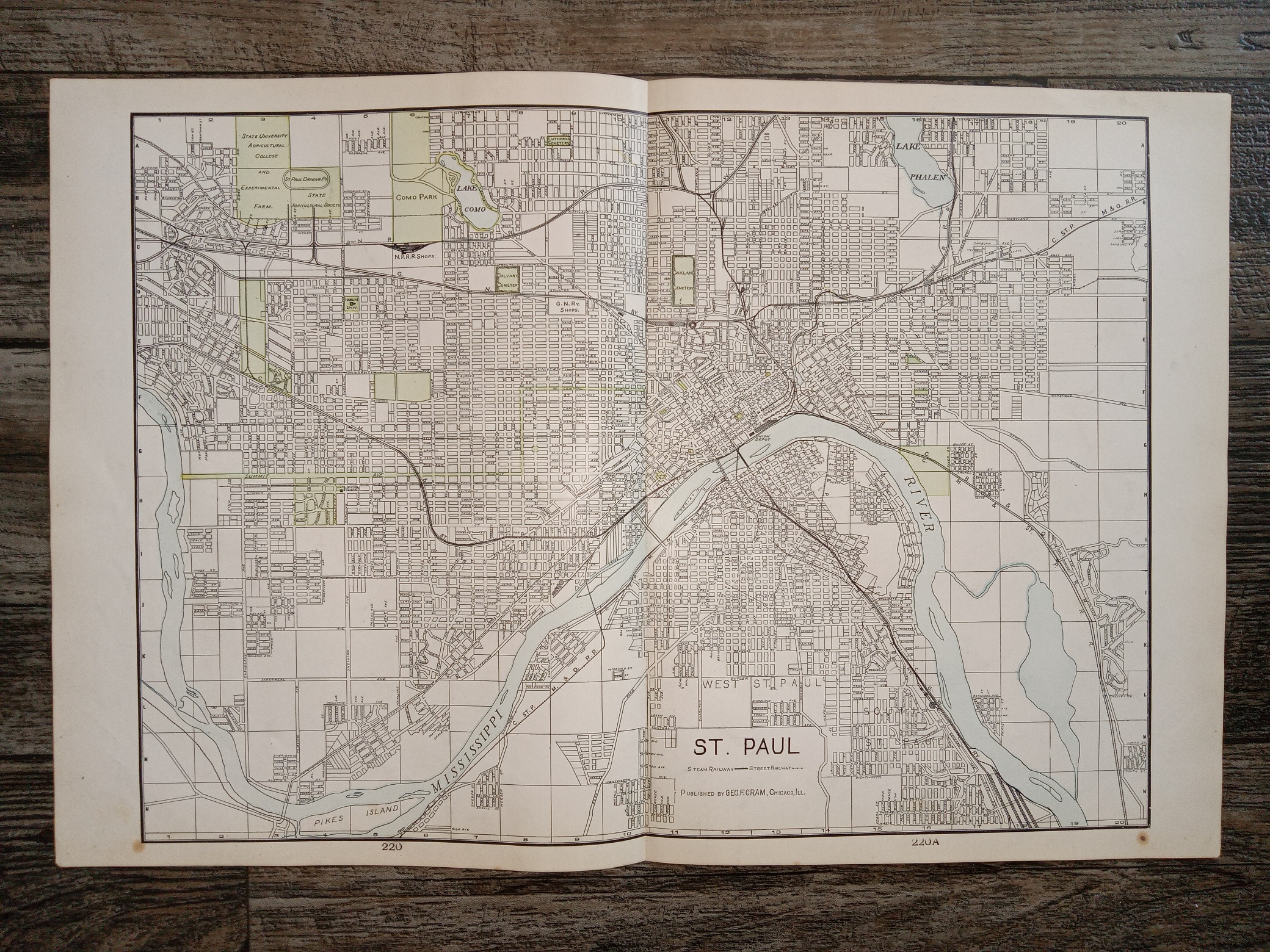 Map taken from a large, old atlas, 22 inches tall; 14 inches wide. Folded in half; fair condition. The map has some small stains, the edges have some tears, and there’s a little writing in pencil.