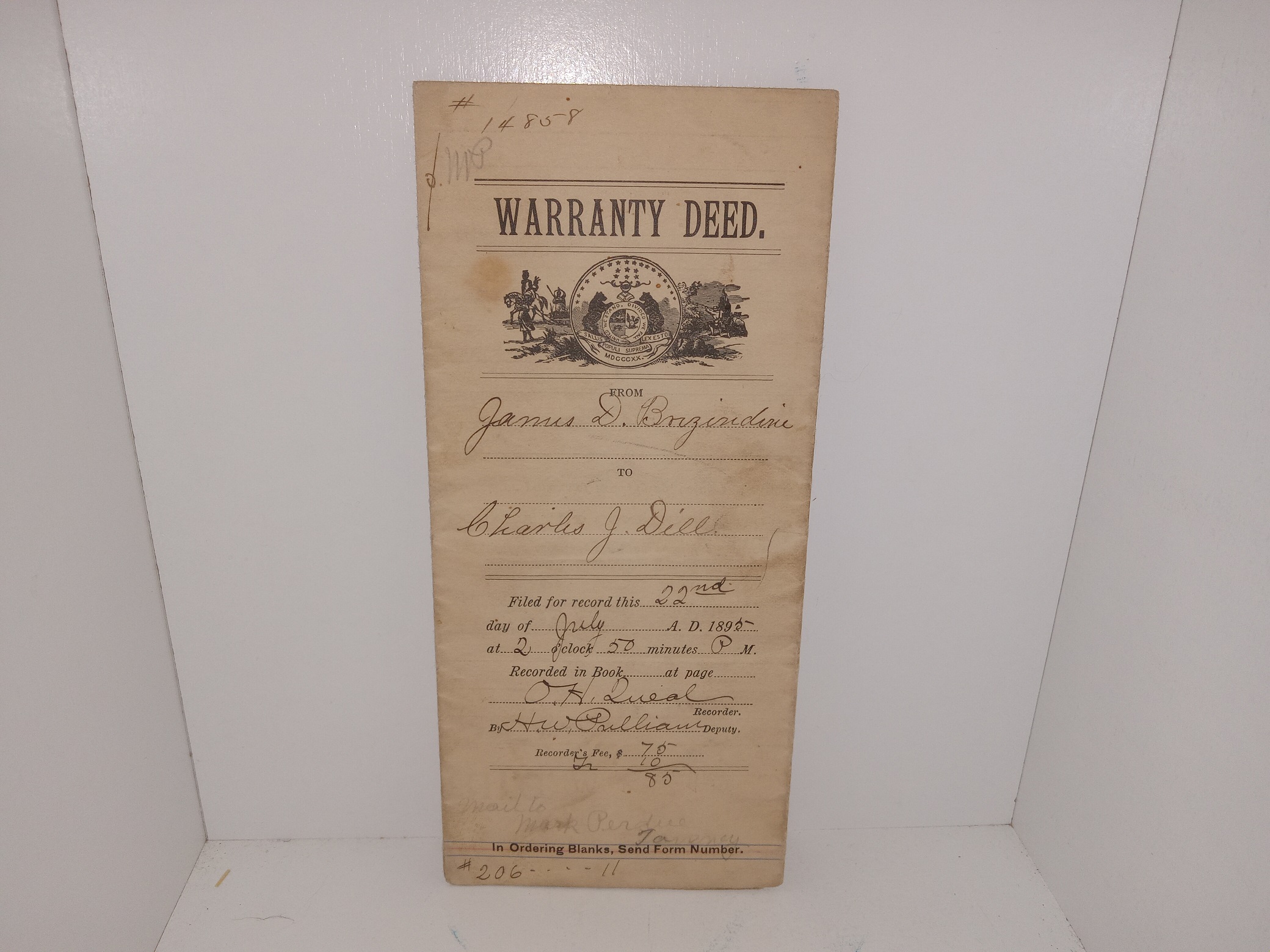Fair condition, thin, tan, fold-up pamphlet. The pages have wrinkling, stains, a debossed stamp, pen marks, and has been filled out in pen.
