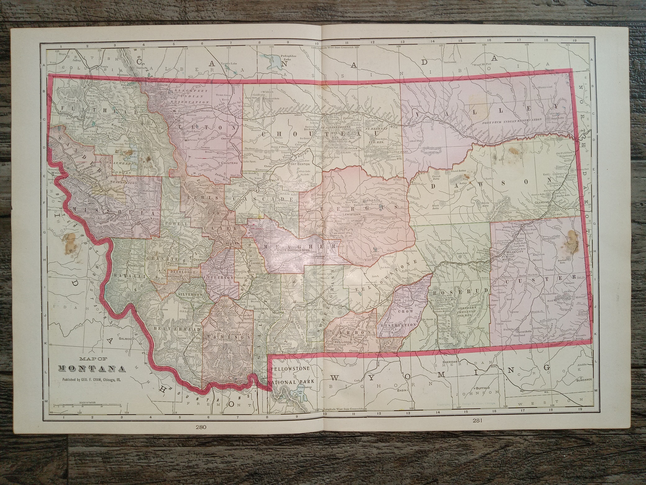 Map taken from a large, old atlas, 22 inches tall; 14 inches wide. Folded in half; fair condition. The maps have stains, the edges have some tears, and there’s a little writing in pencil.