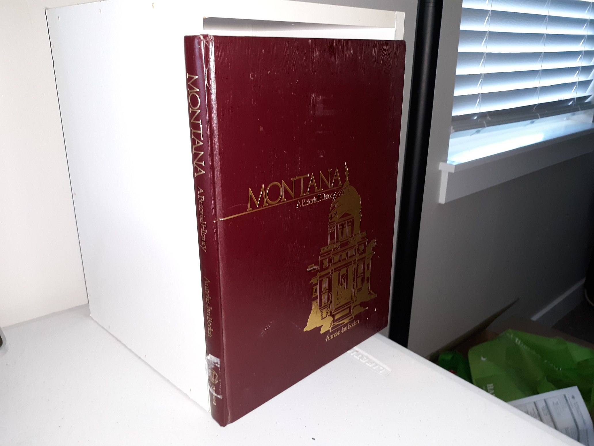 Fair condition, large, thin, burgundy hardcover with no dust jacket. The cover has some small spots, a long scratch, adhesive residue, the remains of sticker on the spine and the back, scuff marks, one slightly crushed corner, and a tear on the right edge of the spine. The front flyleaf has writing in pen and pencil. Text and illustrations throughout are clean, clear, and legible.