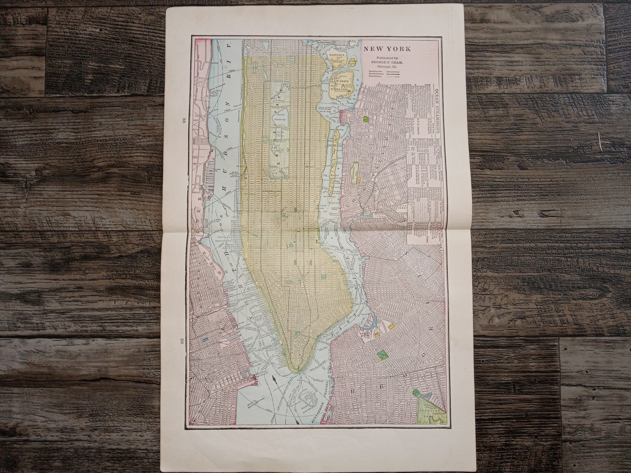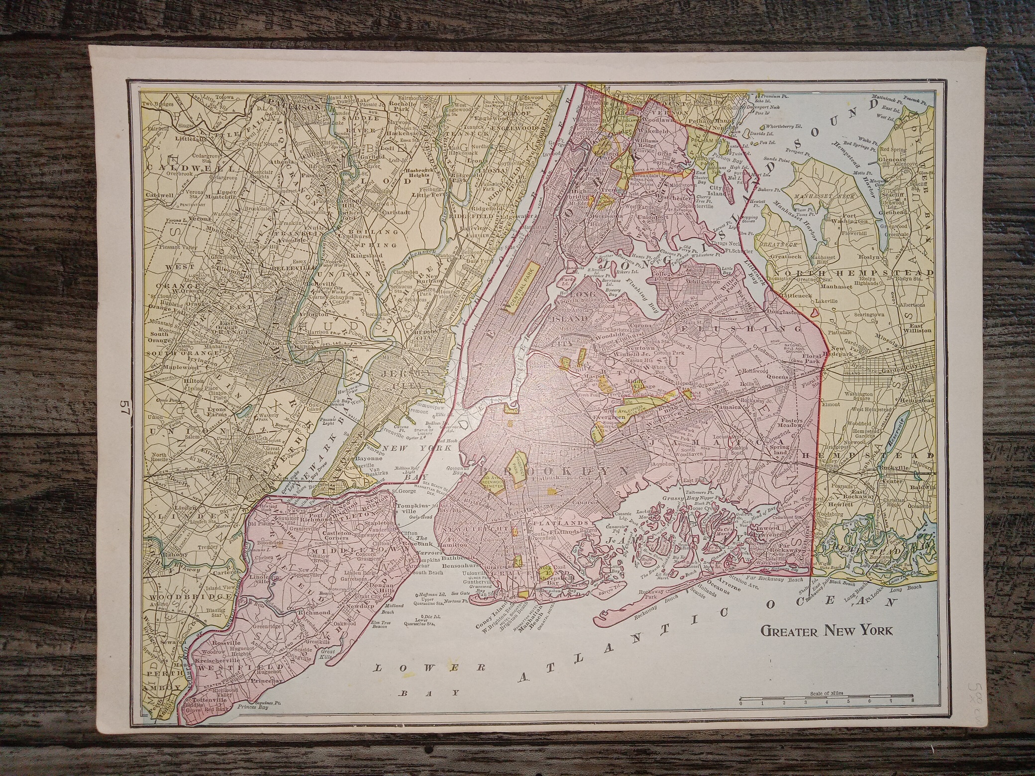 Map taken from a large, old atlas, 22 inches tall; 14 inches wide. Folded in half; fair condition. The maps have some tiny stains, the edges have some tears, and there’s a little writing in pencil.