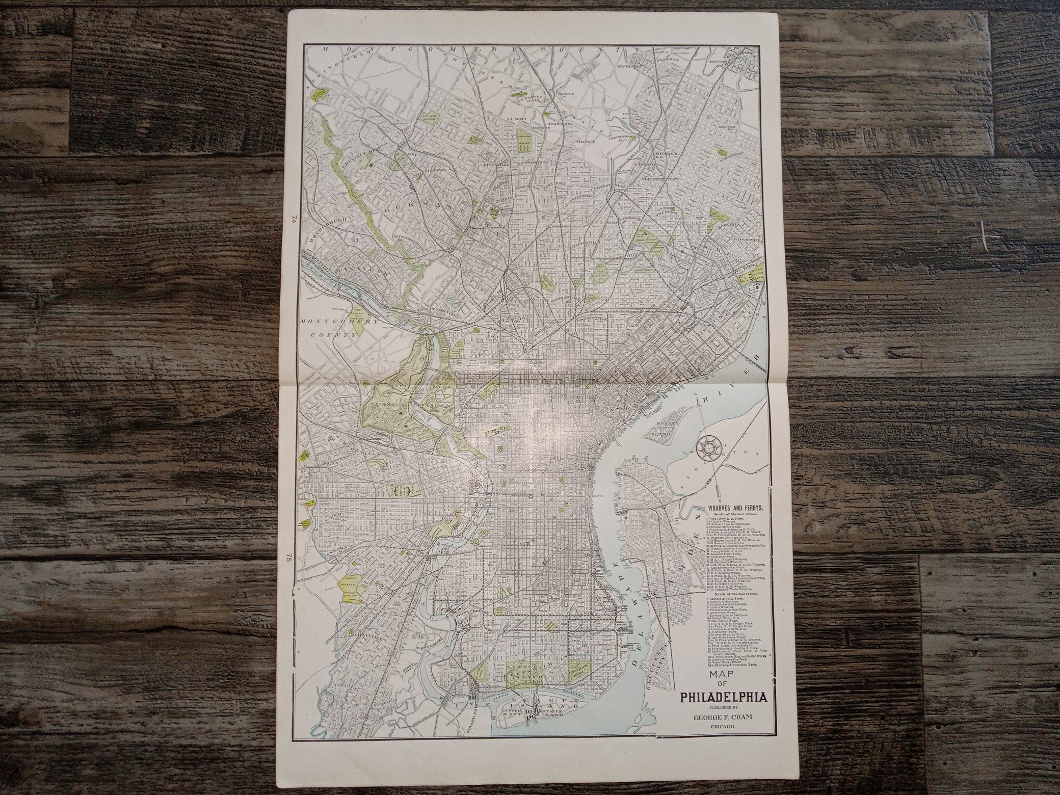 Map taken from a large, old atlas, 22 inches tall; 14 inches wide. Folded in half; good condition. The map has some faint stains, the edges have some tears, and there’s a little writing in pencil.