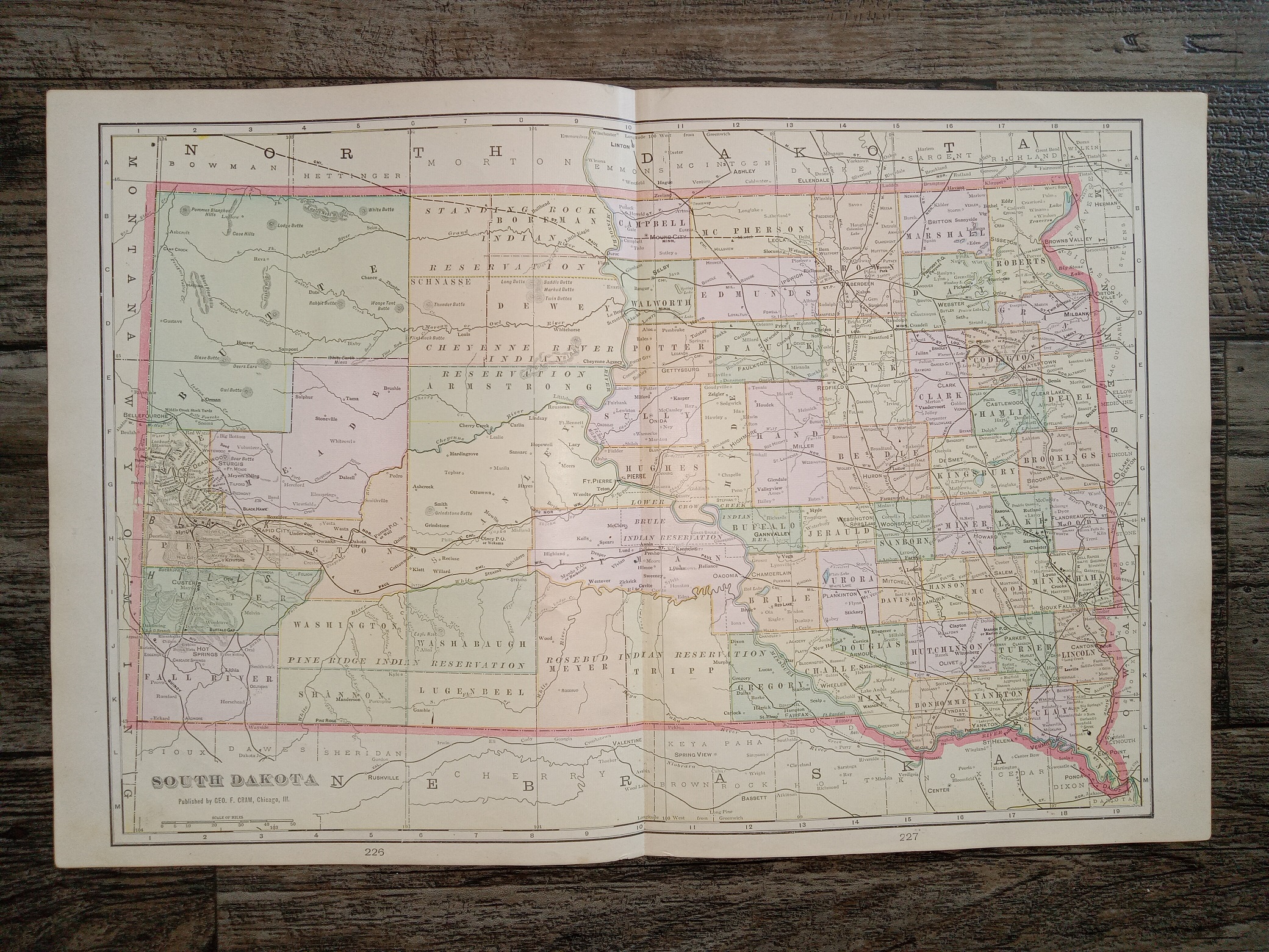 Map taken from a large, old atlas, 22 inches tall; 14 inches wide. Folded in half; fair condition. The map has stains, the edges have some tears, and there’s a little writing in pencil.