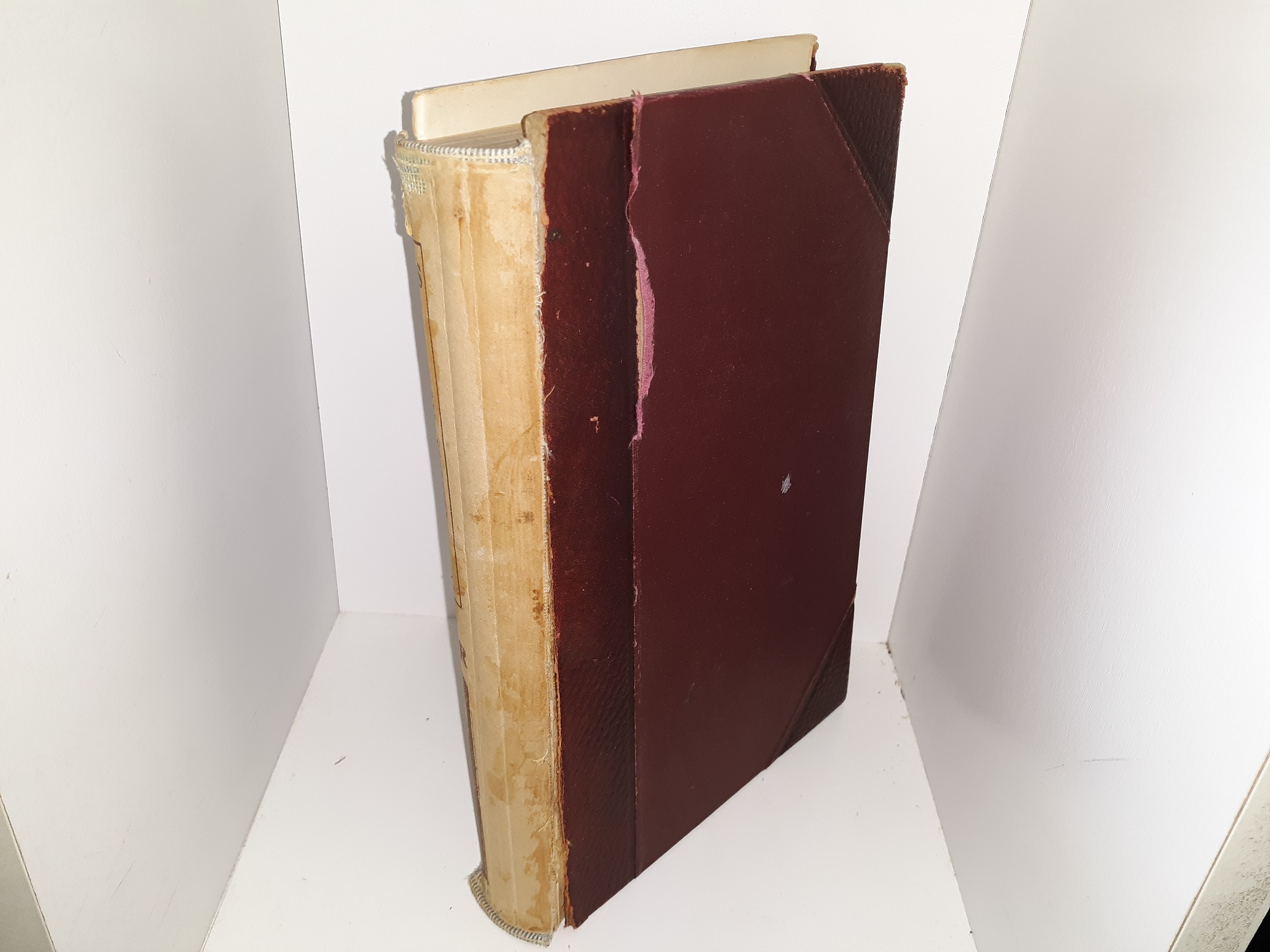 Fair condition hardcover with no dust jacket, and the outer layer of the spine has been completely removed. The cover boards are both detached from the binding. The covers have tears, stains, fraying, heavy scuffing, and fading. Some pages are partially detached from the binding. The back flyleaf is completely detached from the binding. Some pages have small tears, or small pieces torn off the edges, creases or wrinkling. The second flyleaf has writing in pencil and eraser marks. Some pages have faint stains along the edges, but the text and illustrations throughout are clear and legible.