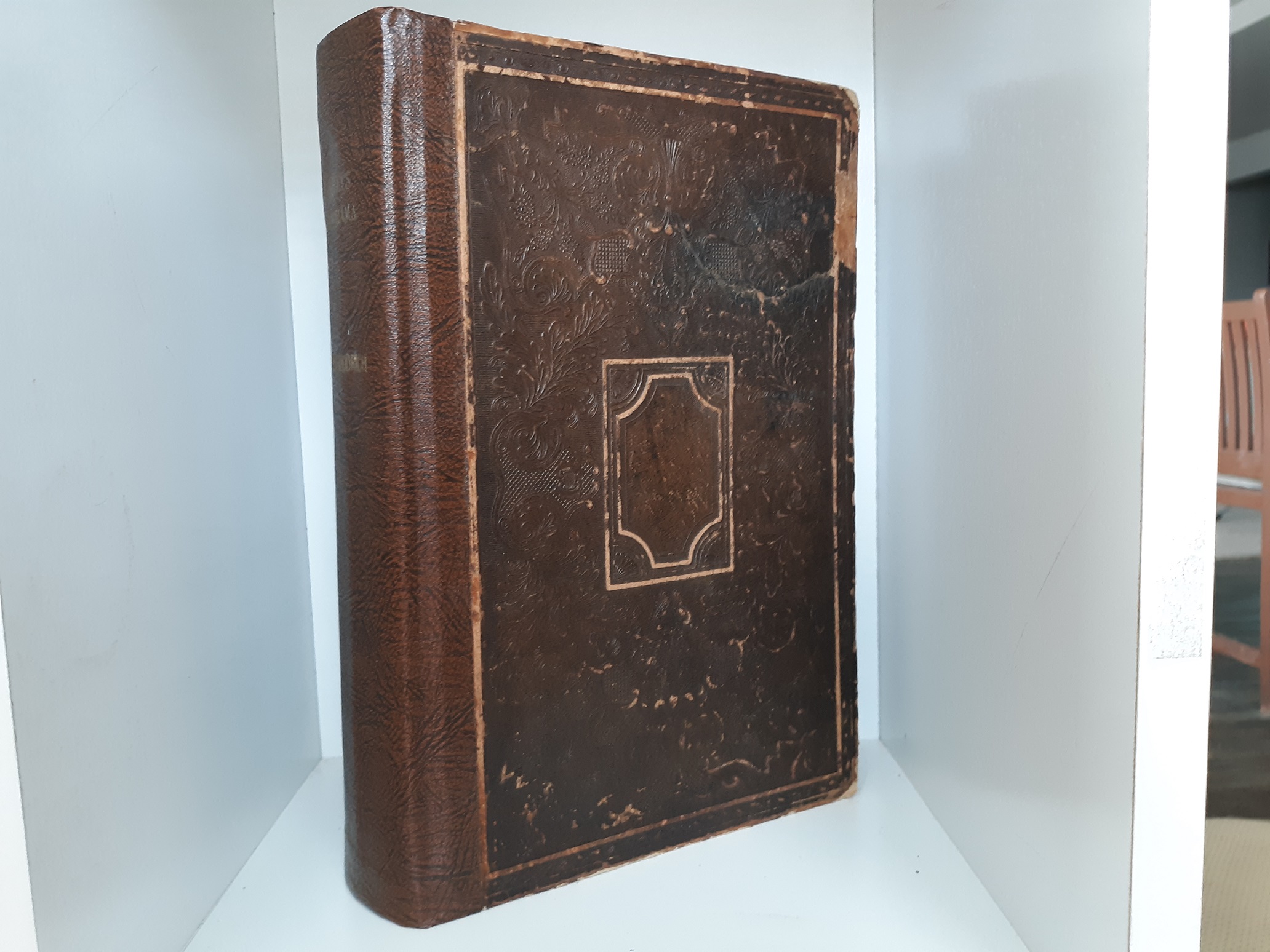Fair condition, thick, brown, leather-bound book with a rebacked spine. The cover has tears, stains, fraying, scratches, and some bubbling. The pages throughout have stains, but the text and illustrations throughout are fully legible. The second and third flyleaves have writing in pencil…………………………….v702 Bx1843B