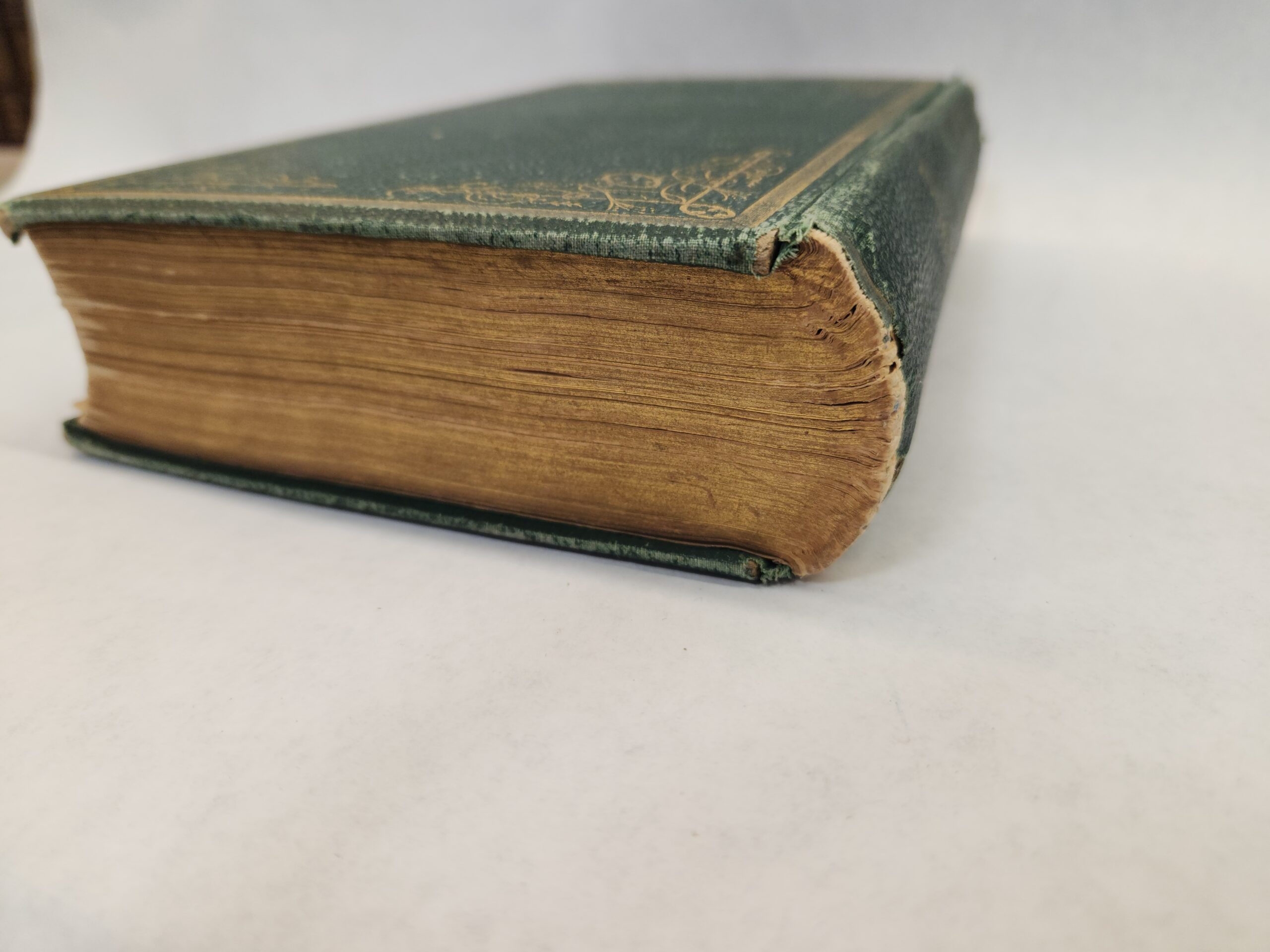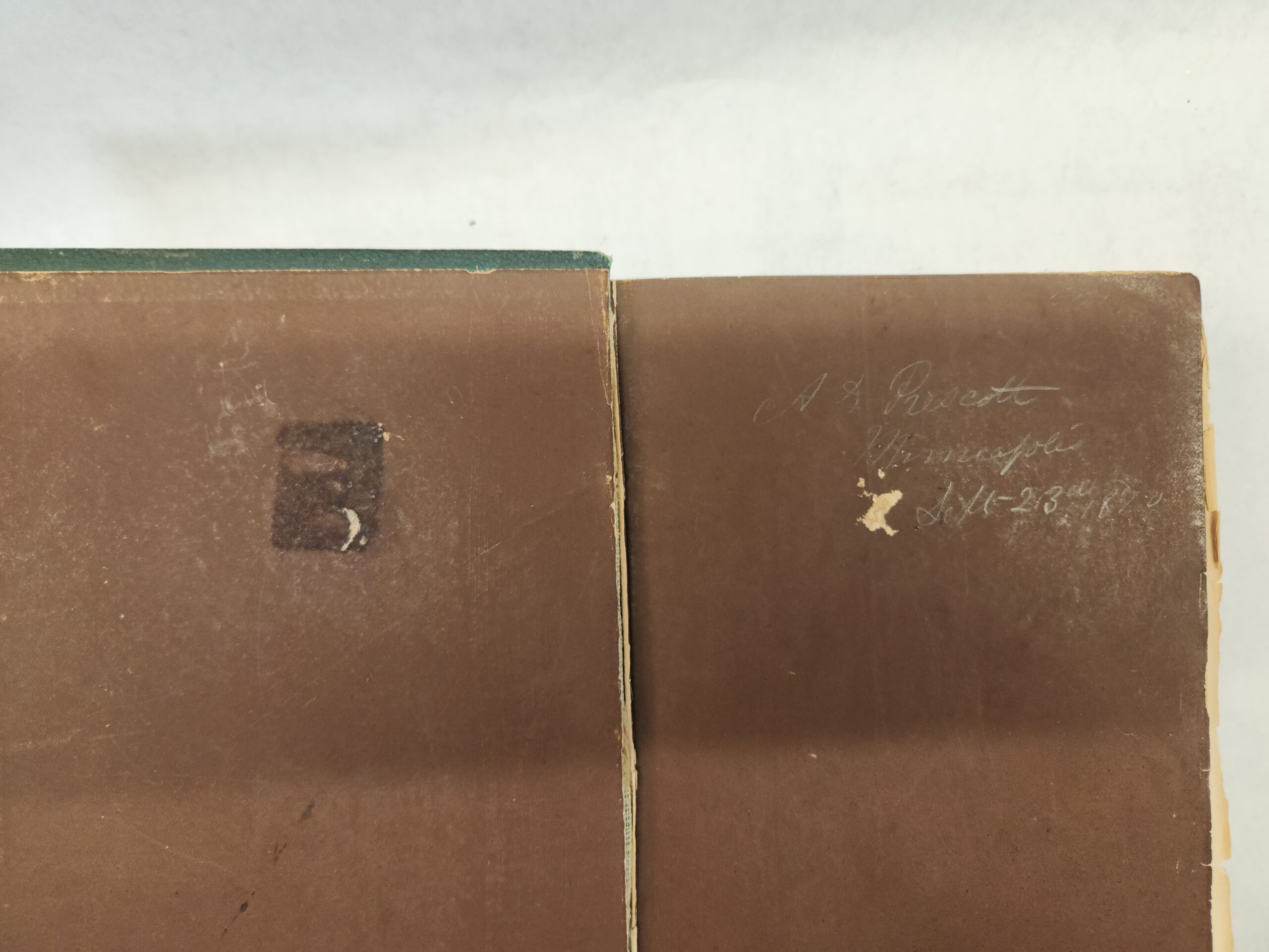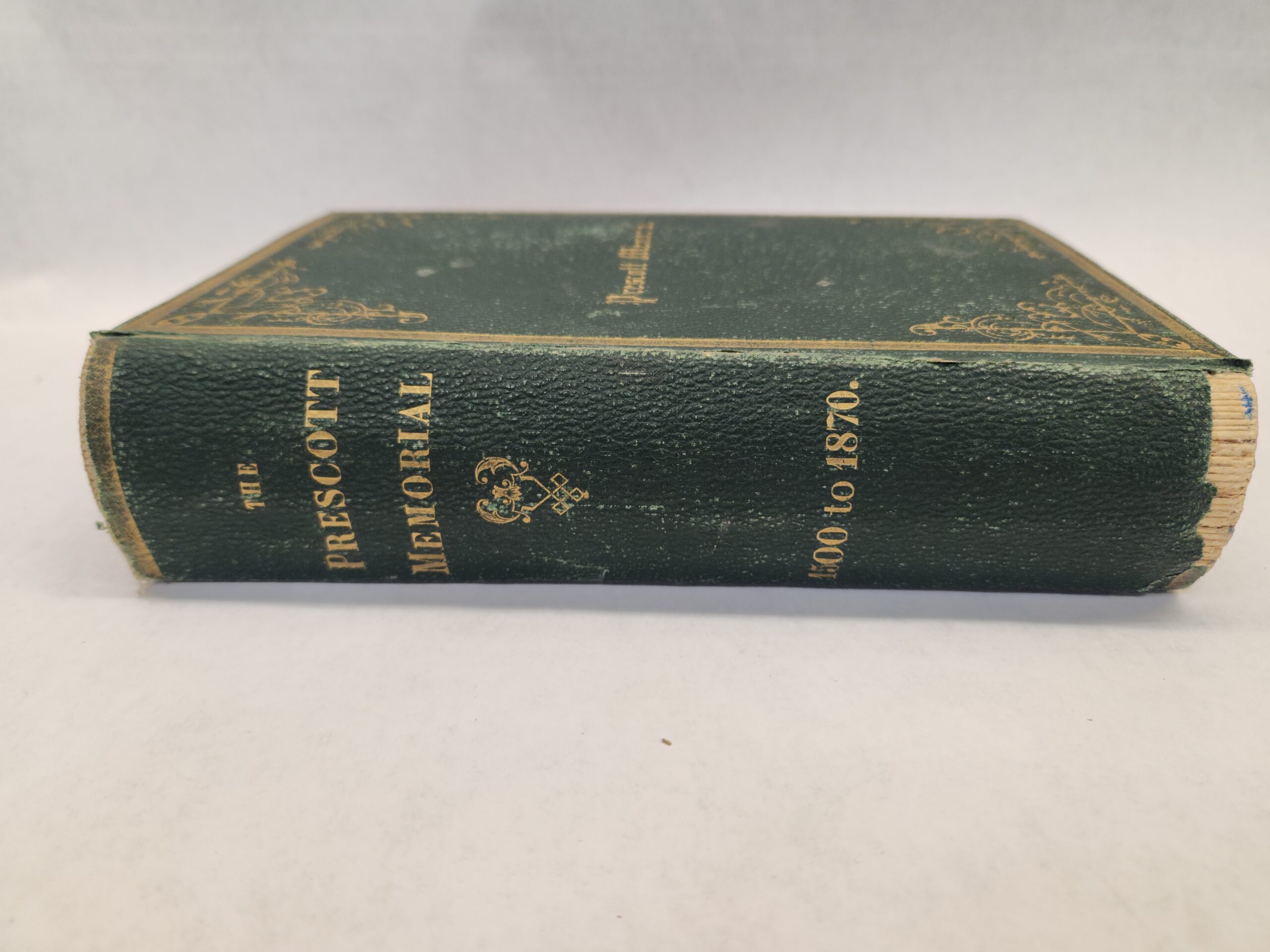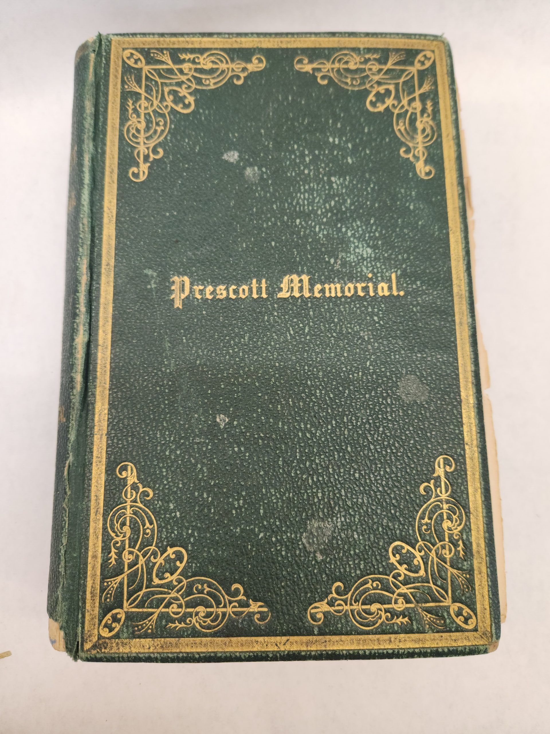 The Prescott Memorial:: or Genealogical Memoir of the Prescott Families in America. In Two Parts- William Prescott, M.D. (1870, First Edition, Hardcover, Green Faux Leather) Binding is still holding but becoming loose. There are a couple loose pages within the book. An inscription written on the inside of the front cover and on the first page. Pages have some small stain marks (see pic in gallery). Cover, front and back, shows wear with rub marks/scuffs/ tears. Bottom of spine is torn off.