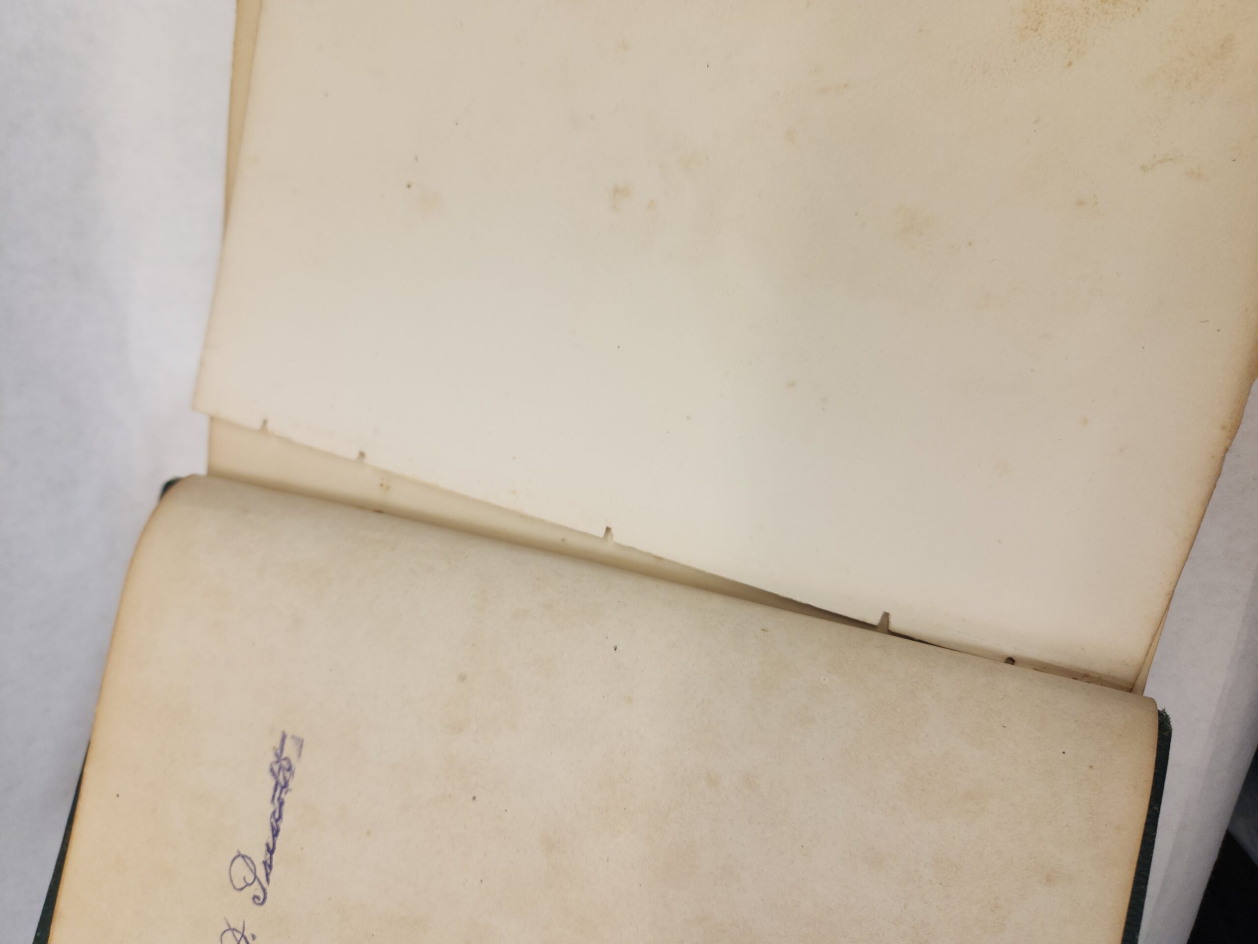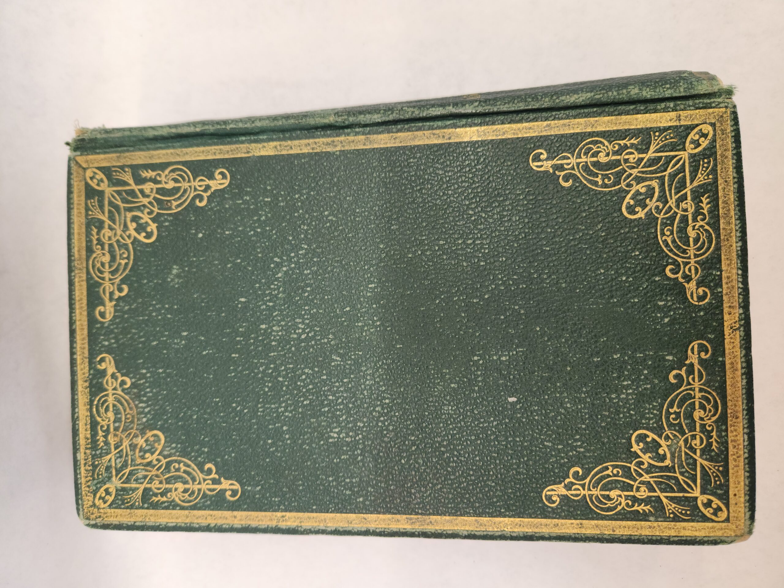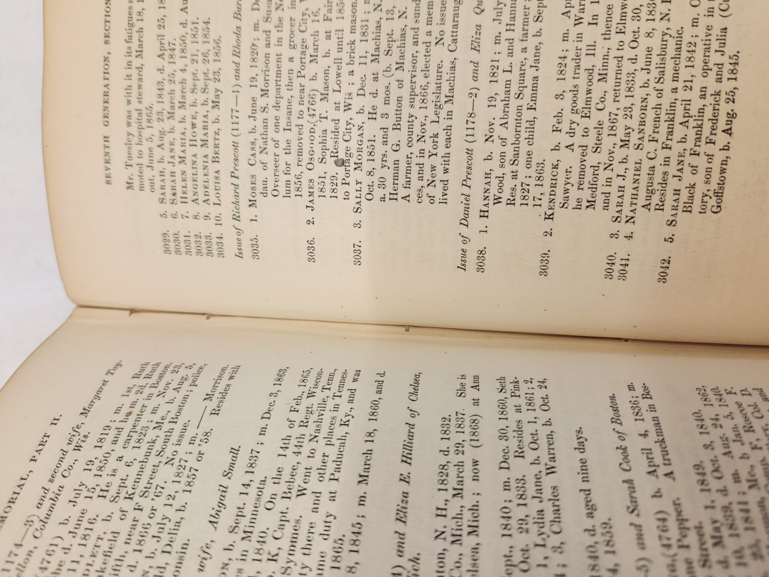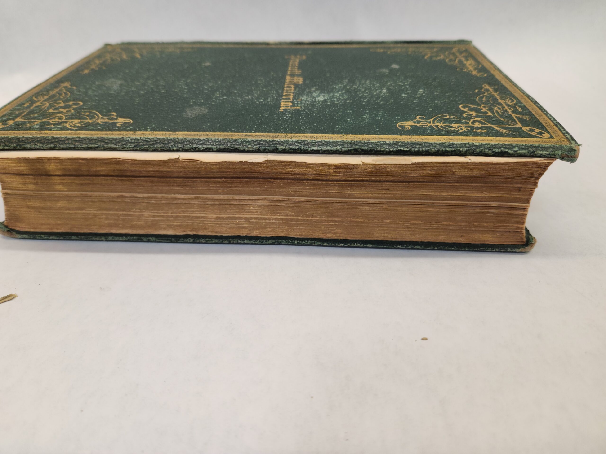 The Prescott Memorial:: or Genealogical Memoir of the Prescott Families in America. In Two Parts- William Prescott, M.D. (1870, First Edition, Hardcover, Green Faux Leather) Binding is still holding but becoming loose. There are a couple loose pages within the book. An inscription written on the inside of the front cover and on the first page. Pages have some small stain marks (see pic in gallery). Cover, front and back, shows wear with rub marks/scuffs/ tears. Bottom of spine is torn off.