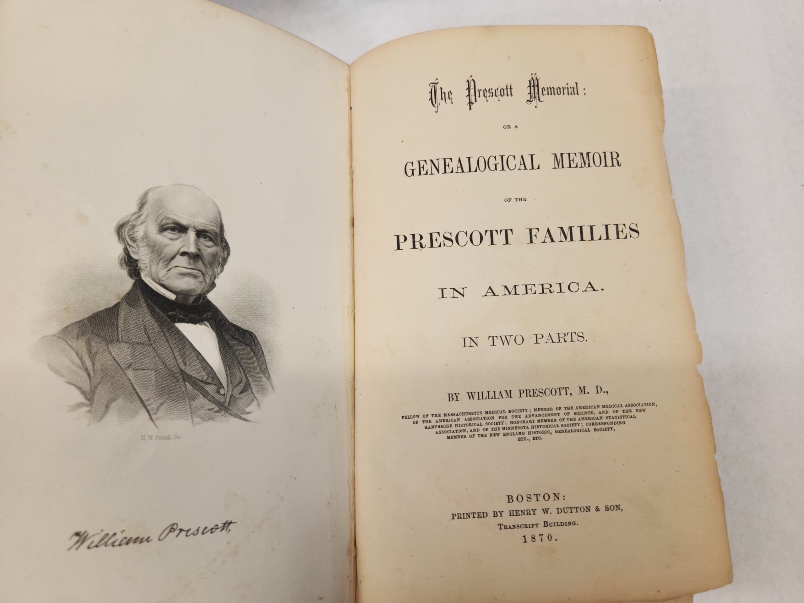 The Prescott Memorial:: or Genealogical Memoir of the Prescott Families in America. In Two Parts- William Prescott, M.D. (1870, First Edition, Hardcover, Green Faux Leather)