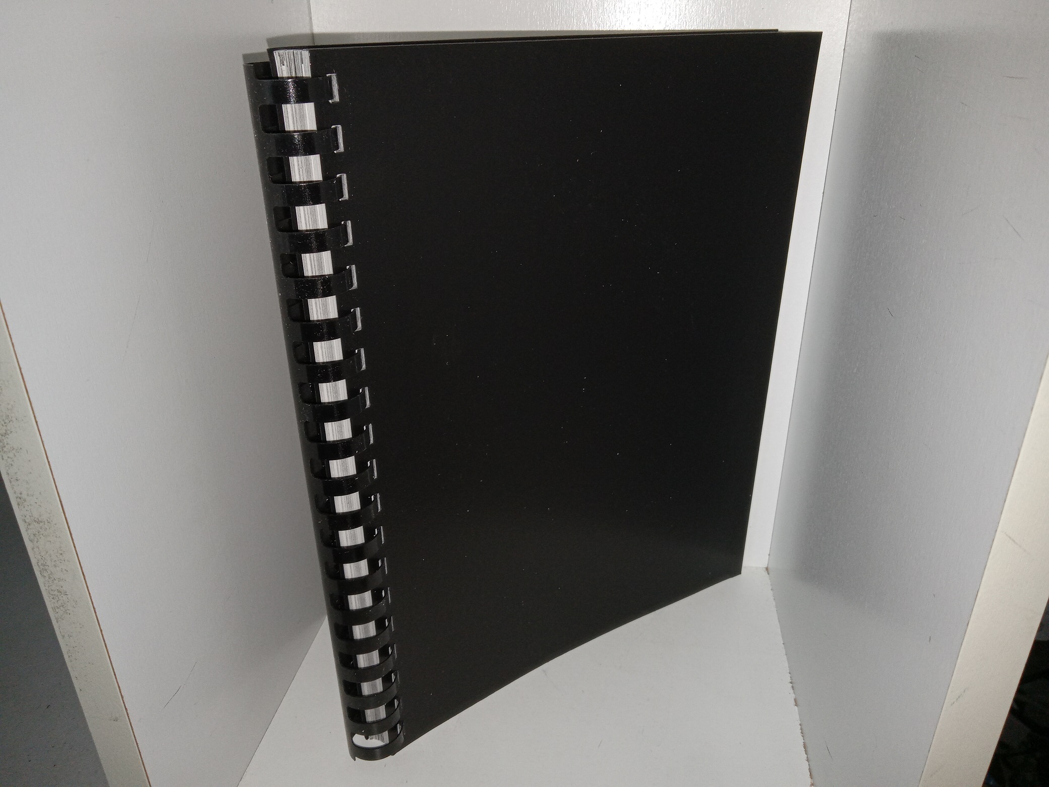 Good condition, large, black softcover with no title printed on the covers, and with a black comb binding. The covers have some scuff marks, and some residue. The first page has writing in pencil, and eraser marks.