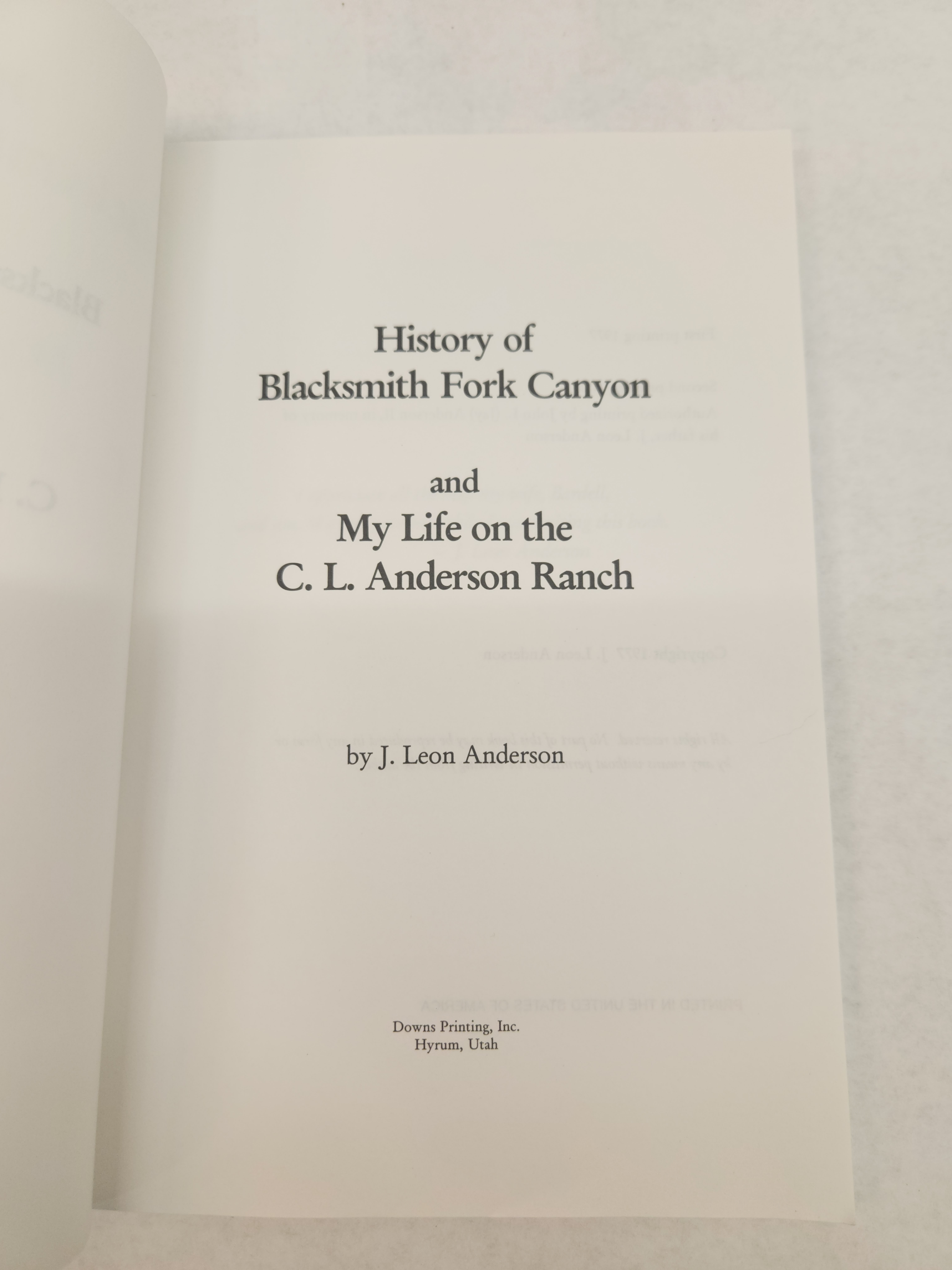 History of Blacksmith Fork Canyon and My Life on the C.L. Anderson Ranch (2000, Paperback) No marks/writing on pages. Corner and edges show some shelf wear. Binding is good. Front cover has sticker residue on the upper left corner and light scuff/scratch marks. Back cover has some light scratch marks and smudge marks.