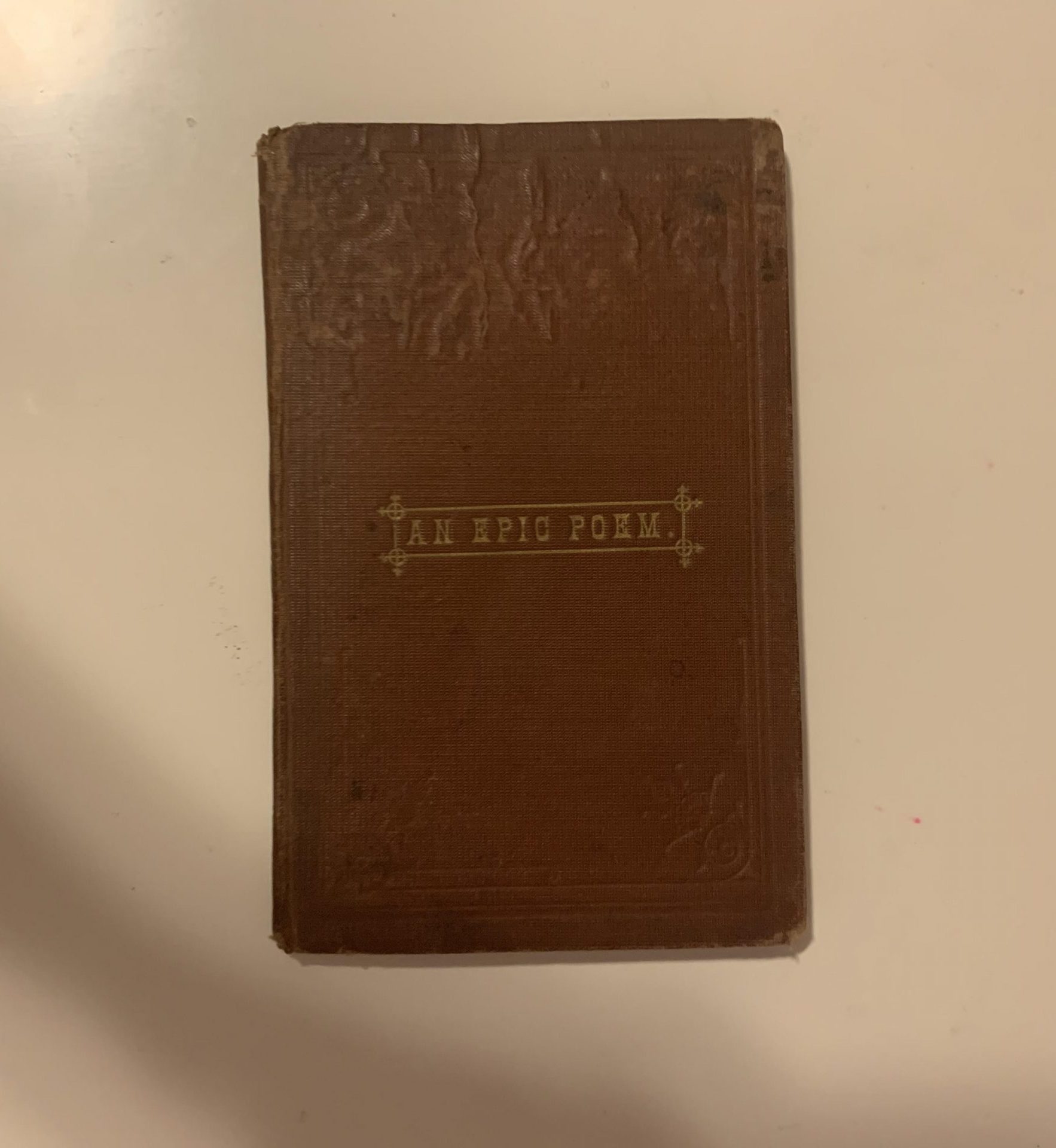 This is a brown hardbound and is in fair condition. There is some fading on the covers. The spine is damaged and faded. There are some stains and marks inside the book. The back cover has a couple of black marks.
