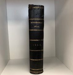 This is black hardbound and is in good condition. The spine is damaged and has pieces coming off of it. The outside of the pages are speckled. There is some damage on the top corner of the front cover.