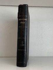 This is black hardbound and is in good condition. The spine is damaged and faded slightly. There are a few white marks on the back cover. The outside pages have some watermarks.