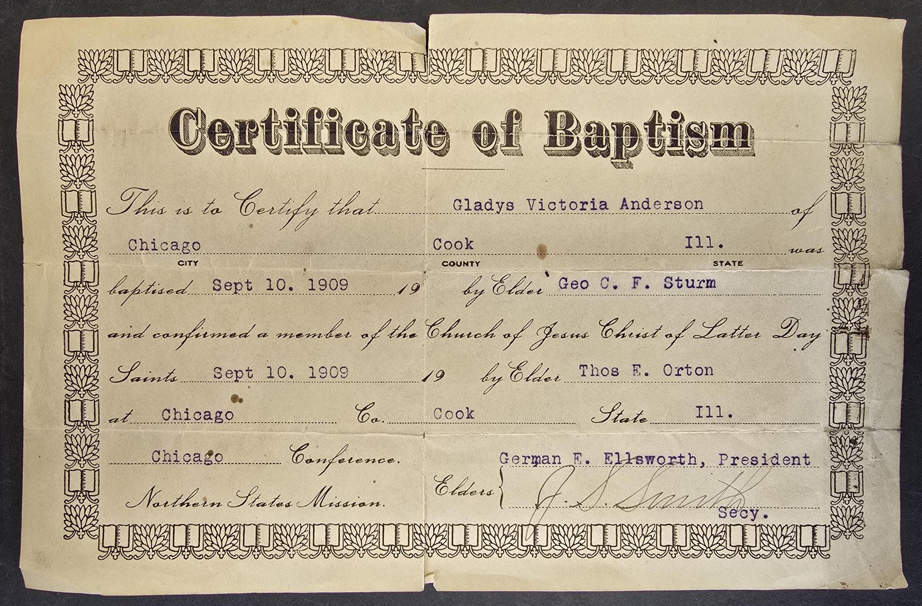 This “Certificate of Baptism” is for Gladys Victoria Anderson and was filled out and signed in 1909.
