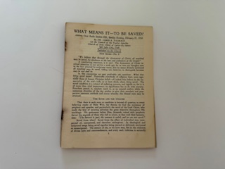 This is a transcription from an address over radio station from Dr. James E. Talmage. This is in good condition. There is some discoloration to the pages. There is also some dark marks around the staples. The text is in perfect condition.