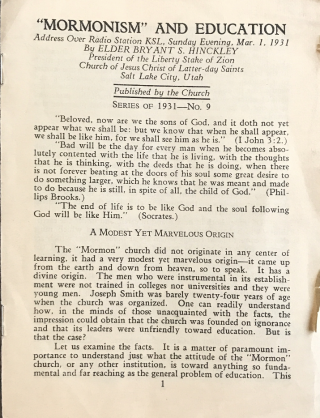 1931 ~ No. 9 ~ “Mormonism” and Education