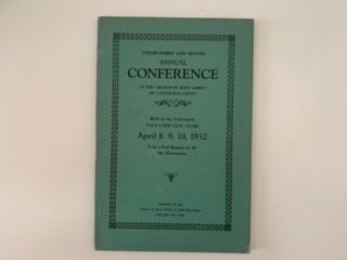 This is a conference report from 1932 and is in good condition. There is some damaged on the bottom of the spine. There is some black marks and fading on the covers.