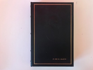 This is a blue and gold leather book and is in perfect condition. The corners are slightly damaged. The outside of the pages are gold and the book has a silver book mark. There is a name engraved on the cover.