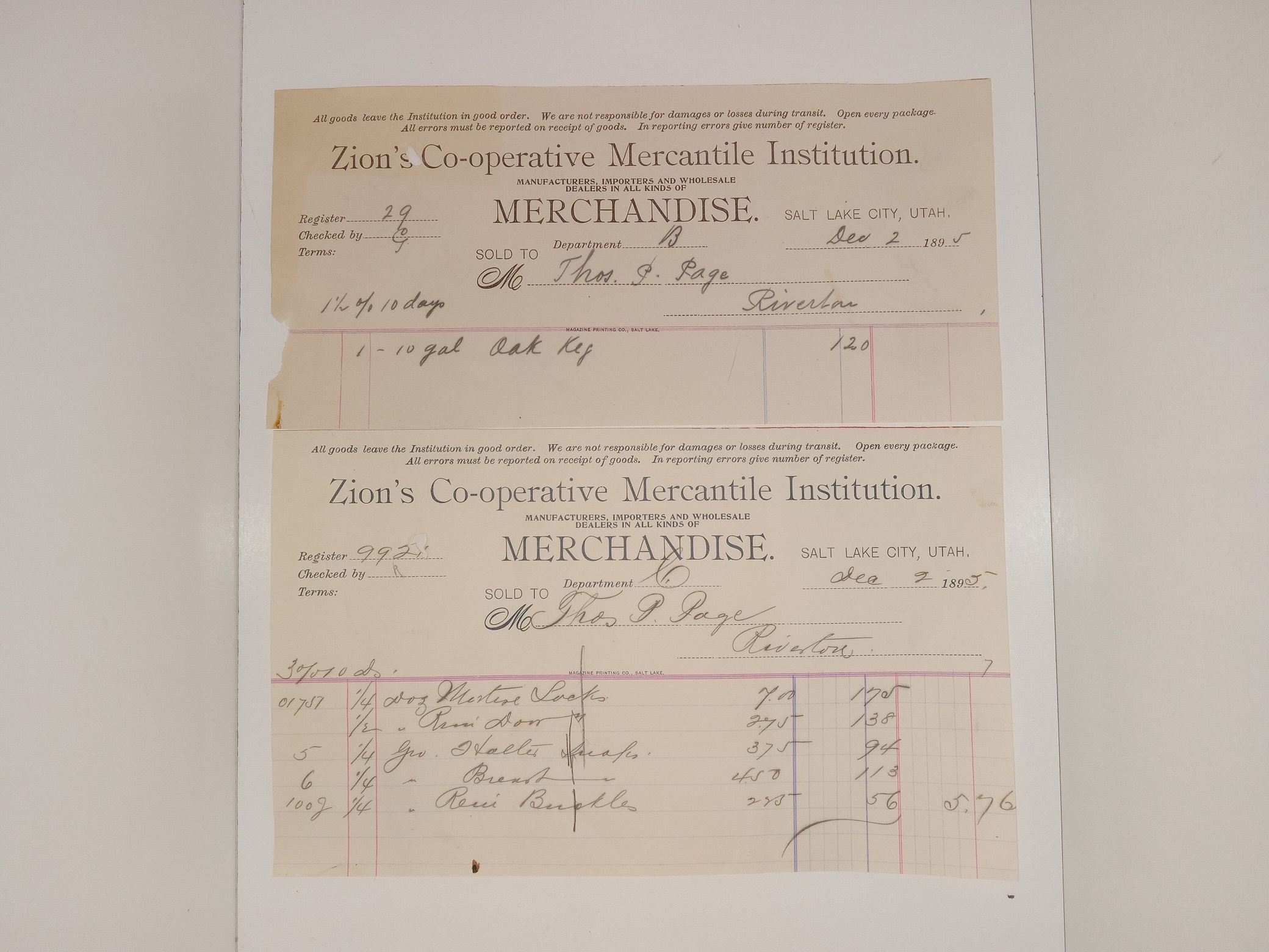 2 fair condition receipts. The receipts has pieces torn off, creases, writing in pen and pencil, tears, stains, some wrinkling, and the remains of something the receipts used to be stuck to.