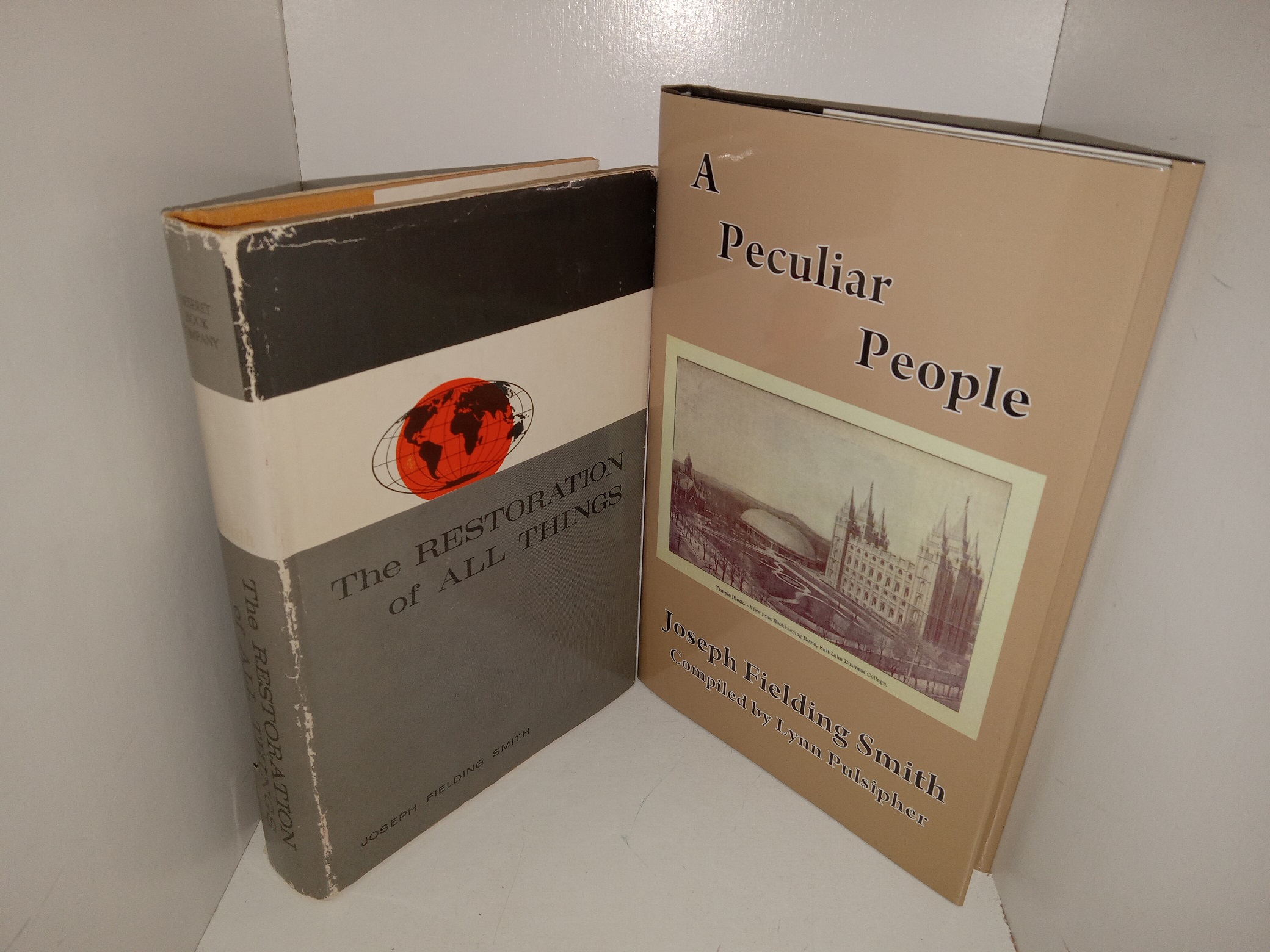 2 fair-very good condition hardcovers with dust jackets. The Restoration of All Things has heavy scuffing, tears, pieces torn off, creases, some residue, small dark marks, and wrinkling on the dust jacket; the cover has some scuffing on the corners and edges; the inside covers and flyleaves have some yellowing; and the front flyleaf has writing in pencil and eraser marks. A Peculiar People has no visible wear on the dust jacket or cover; the second title page has a signature written by the compiler (Lynn Pulsipher) in pen! Text throughout both books is clean, clear, and legible.