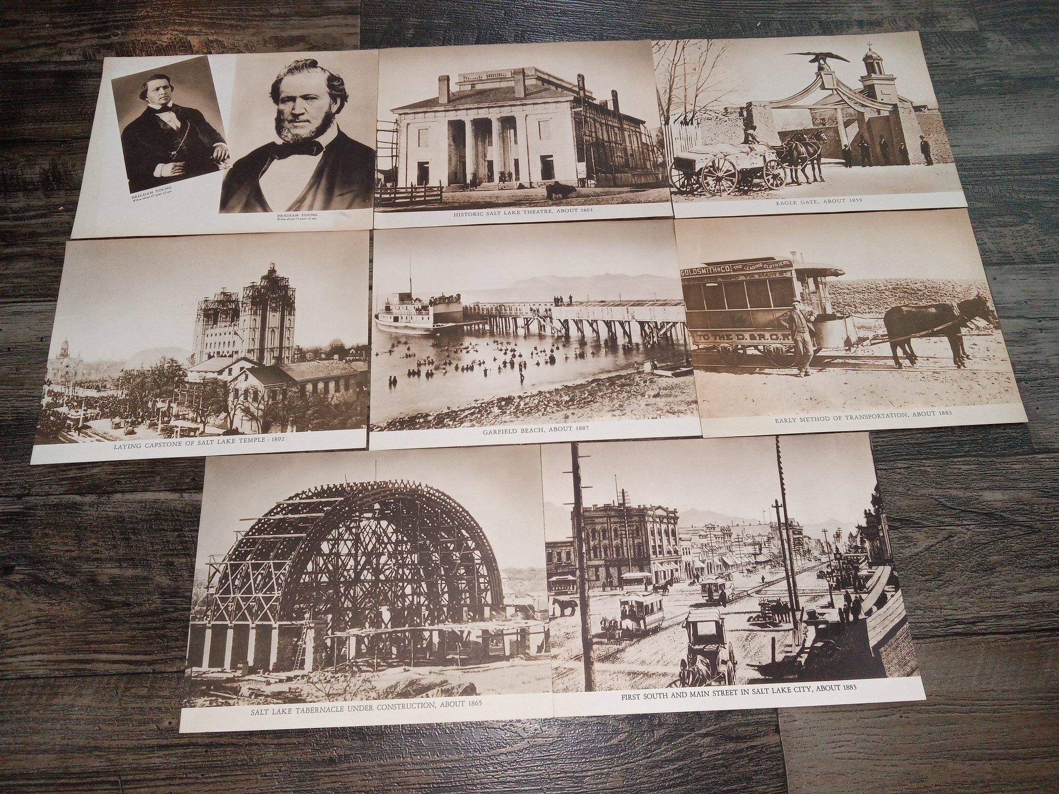8 single sheet prints of pictures. The pictures may have some creases, tiny tears on the edges, yellowing, or some faint stains and fading ink stamps on the backs.