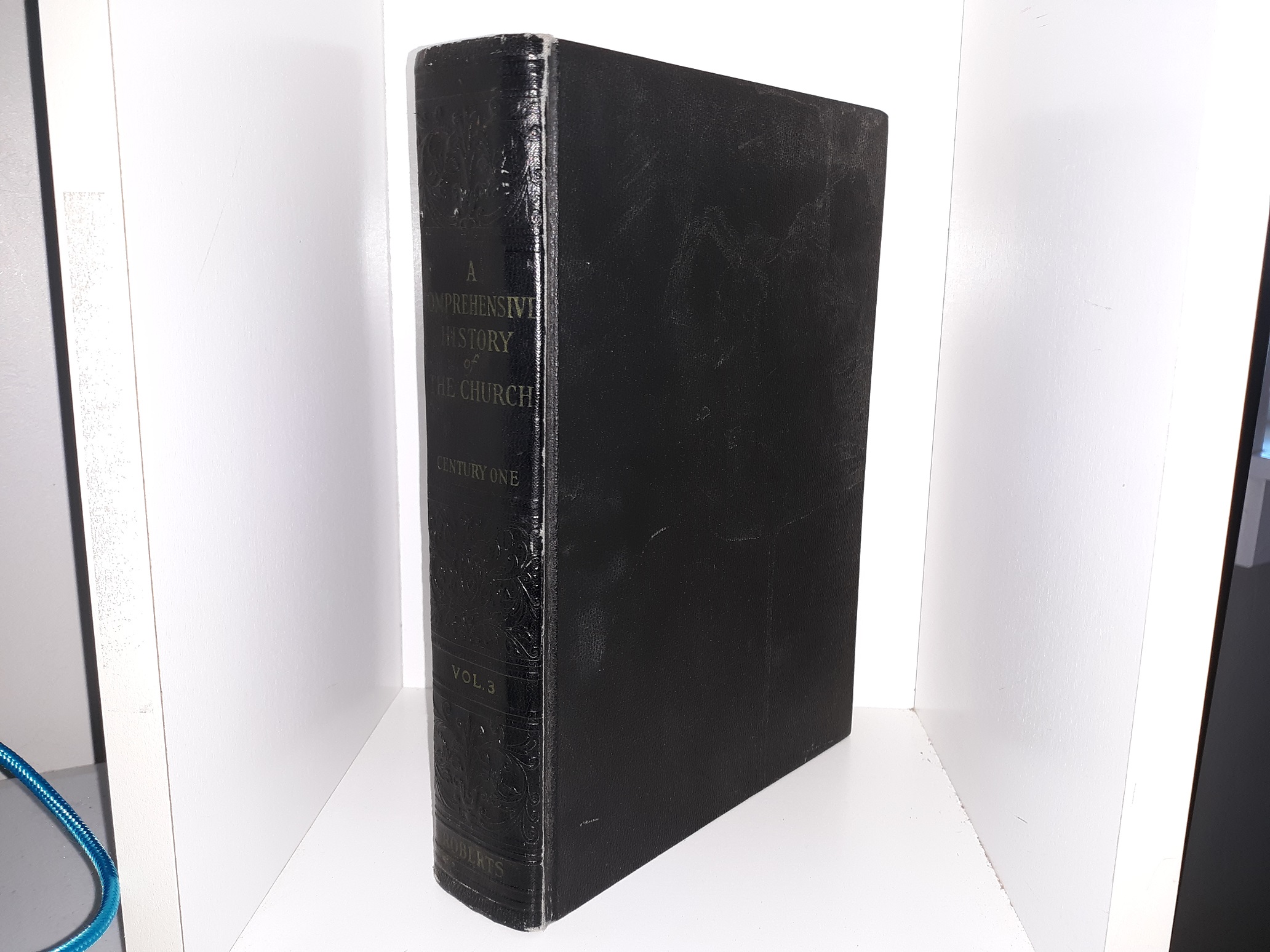Fair condition, large, black hardcover with no dust jacket. The cover has scuff marks, fading, scratches, and some wear at the corners and edges. The front inside cover has writing in pen. The front flyleaf has writing in pencil and eraser marks. There are notes and marks written throughout the text of the book in pen and pencil.