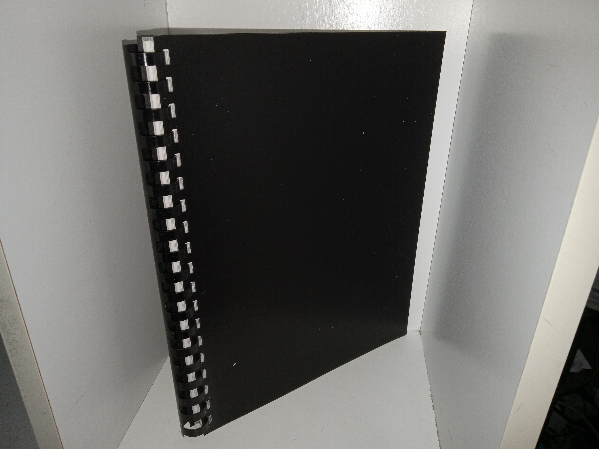 Good condition, large, black softcover with no titles printed on the covers, and with a black comb binding. The covers have some scuff marks, and some residue. The first page has writing in pencil, and eraser marks. Text throughout is clean, clear, and legible.