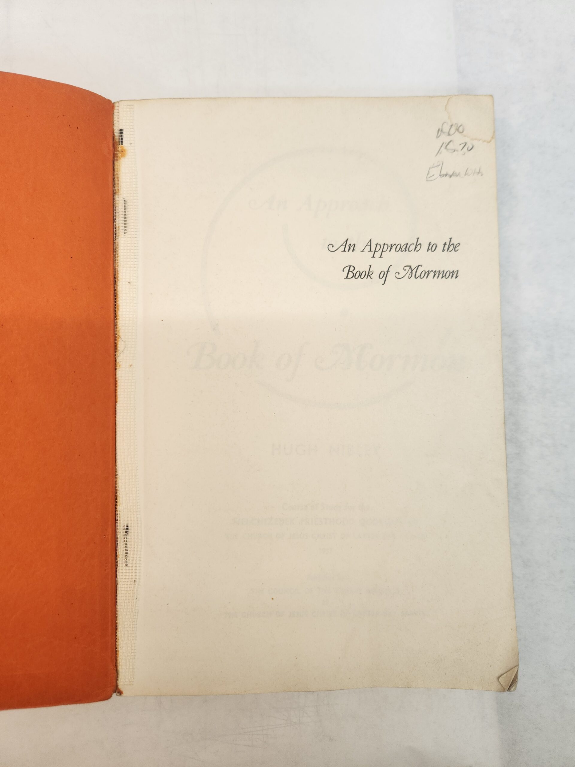 An Approach to the Book of Mormon by Hugh Nibley (1957, Paperback) No writing or marks on pages. Corners and edges show moderate shelf wear with bends, dents/dings, and scuffs. Cover warps up slightly so does not lay flat when on flat surface (see pic for example). Binding is good. Cover, front and back, has smudging, circular marks, and sticker residue. Spine has a couple small tears (one on top and one on the bottom).