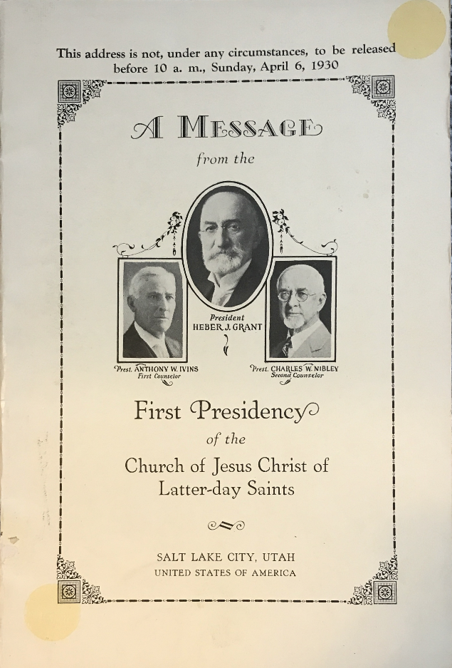 / April 6, 1930 ~ A Message from The First Presidency of the Church of Jesus Christ of Latter-day Saints