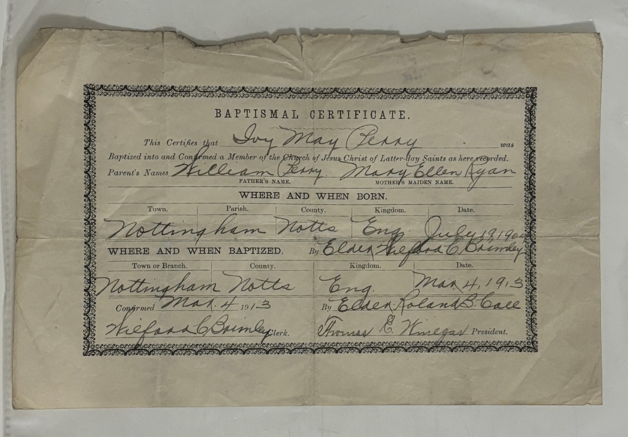 Fair – Good condition Baptismal Certificate. Creasing, tears, blemishes, in sheet protector.