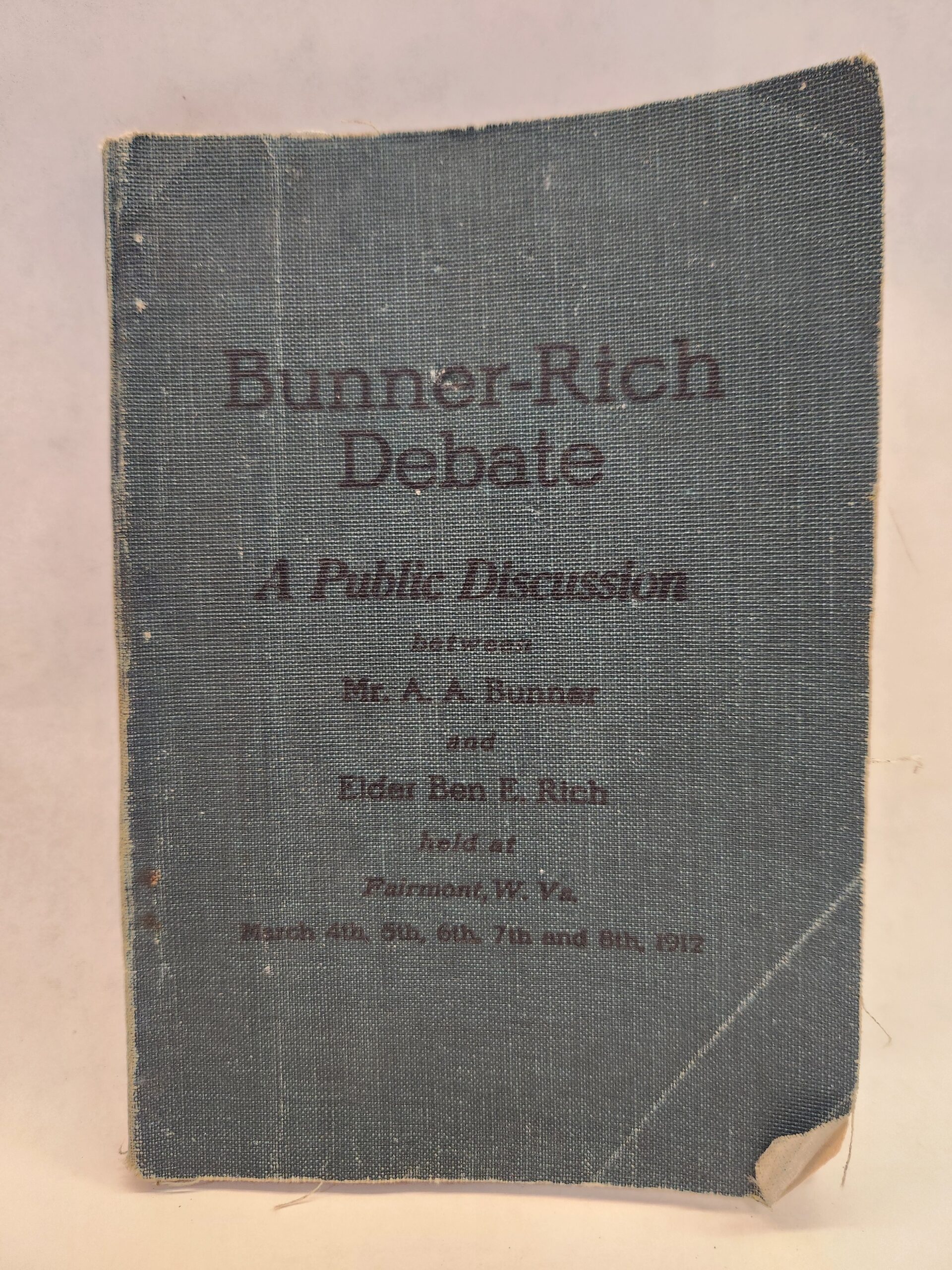 Bunner-Rich Debate:: A Public Discussion between Mr. A. A. Bunner and Elder Ben E. Rich held at Fairmont, W.Va., March 4th, 5th, 6th, 7th, and 8th, 1912 (1912, Paperback) Some annotations in red and blue pencil throughout the book and a name written on the inside of front cover in pen (see pic in gallery for example). Binding is good. Cover, front and back, shows wear with scuffs, a couple small stain marks, and several bend marks. Corners and edges show shelf wear with scuffs and wrinkling.