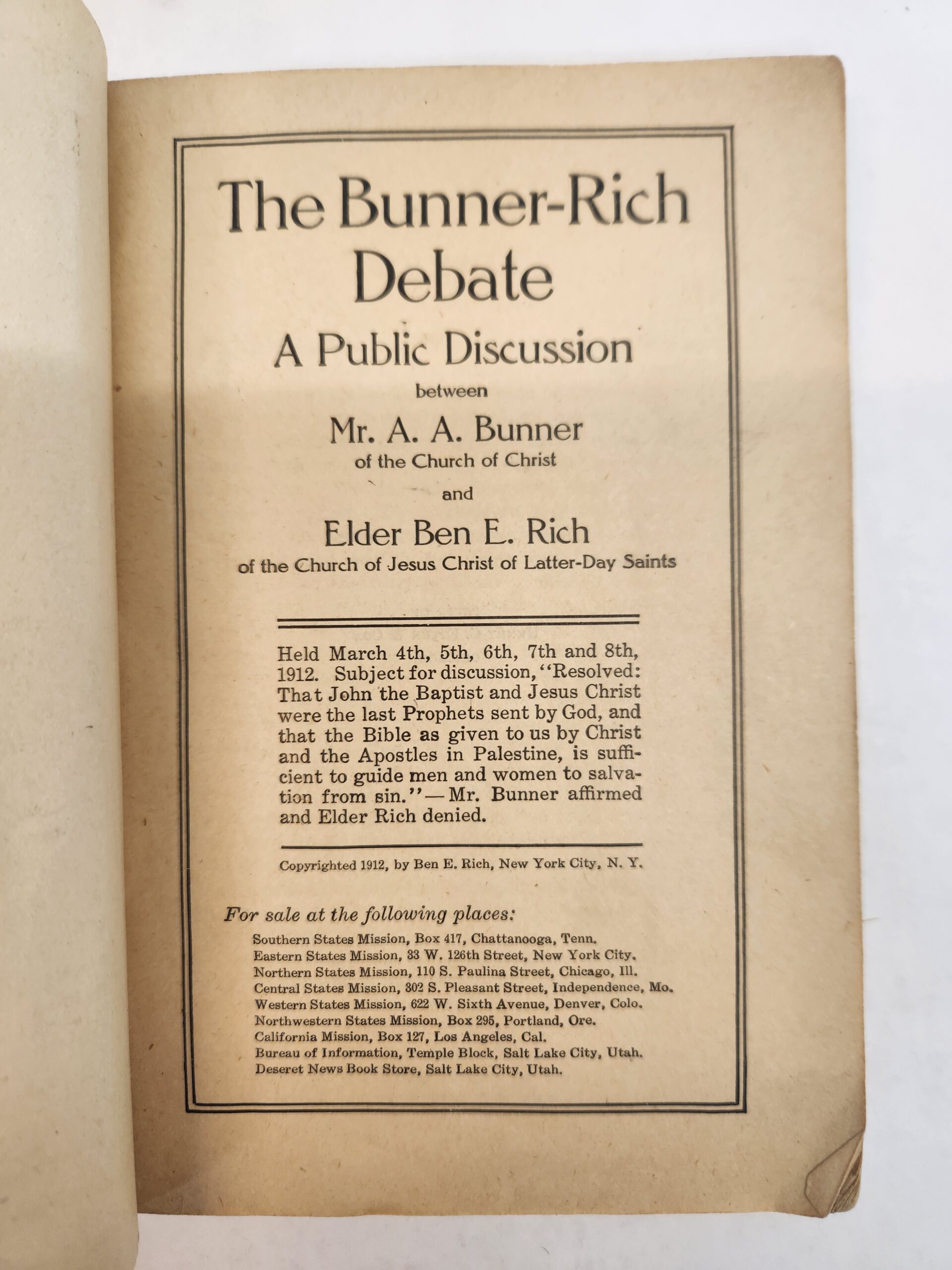 Bunner-Rich Debate:: A Public Discussion between Mr. A. A. Bunner and Elder Ben E. Rich held at Fairmont, W.Va., March 4th, 5th, 6th, 7th, and 8th, 1912 (1912, Paperback)
