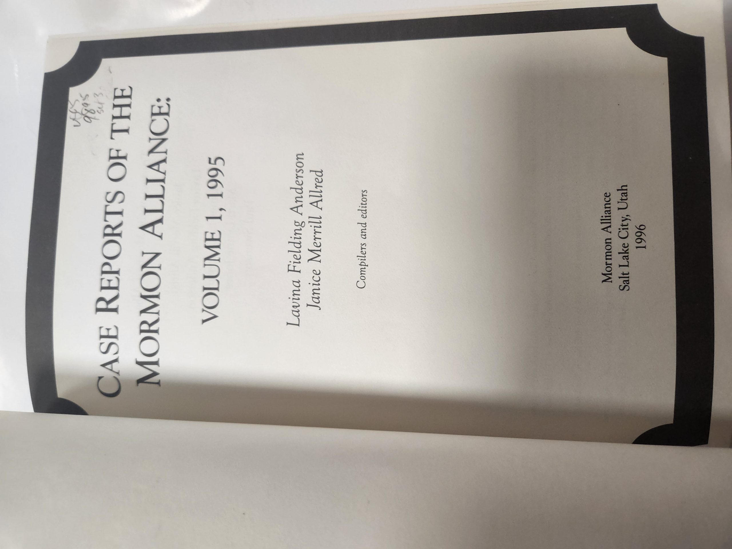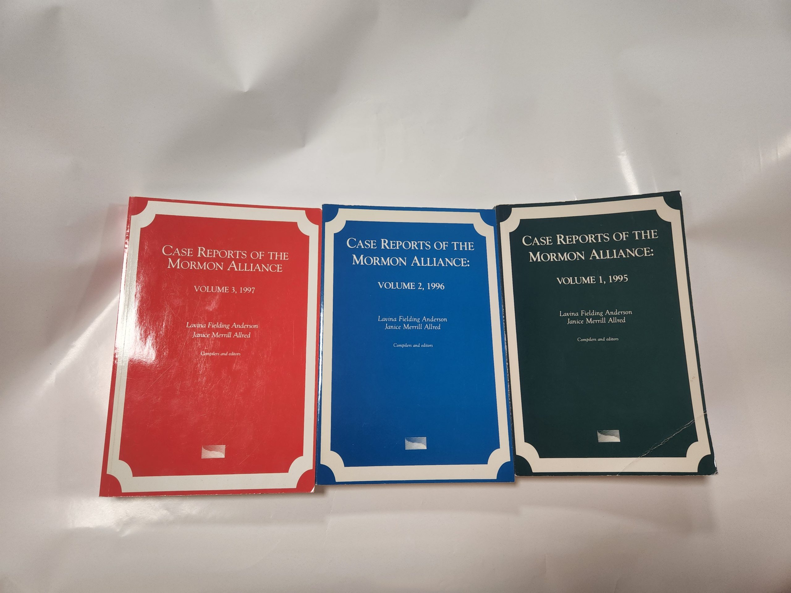 Case Reports of the Mormon Alliance complied/editors Lavina Fielding Anderson and Janice Merrill Allred (paperback-3 vol. set, 1995-97) Volume 1: no markings, crease on the bottom right corner of cover, several dings and scratches. Volume 2 and 3: no markings and a few smudges and dings/scratches on cover.