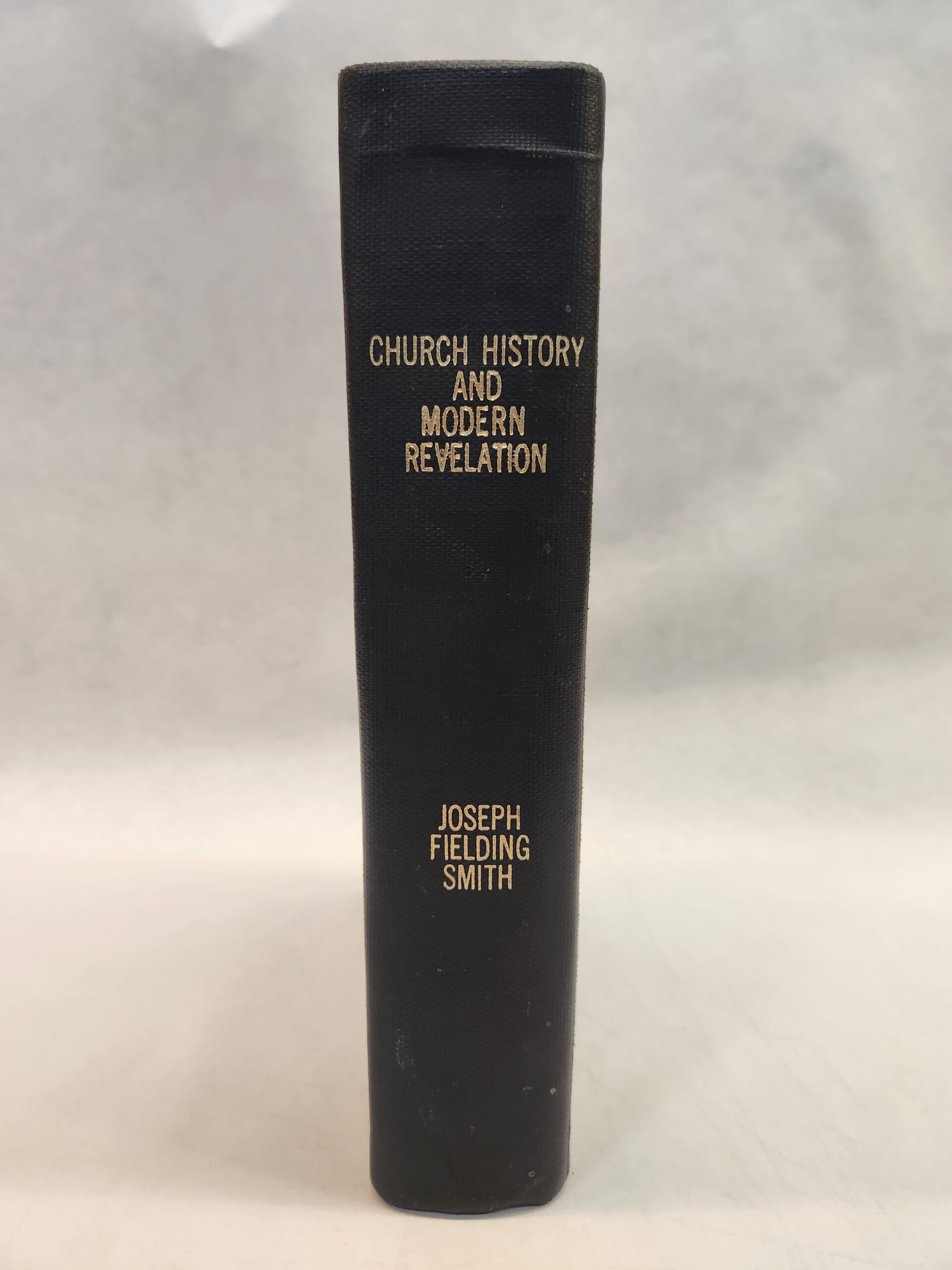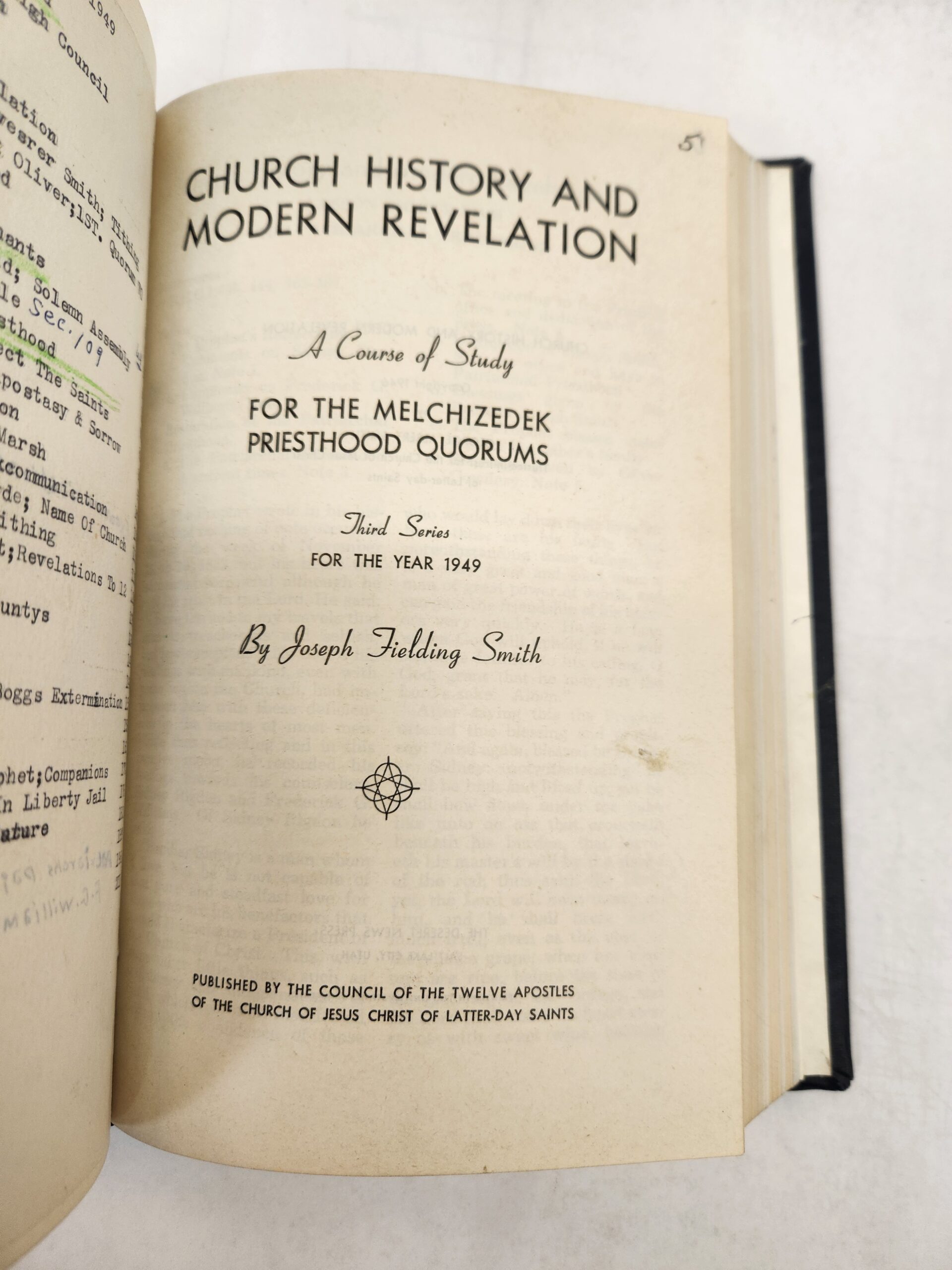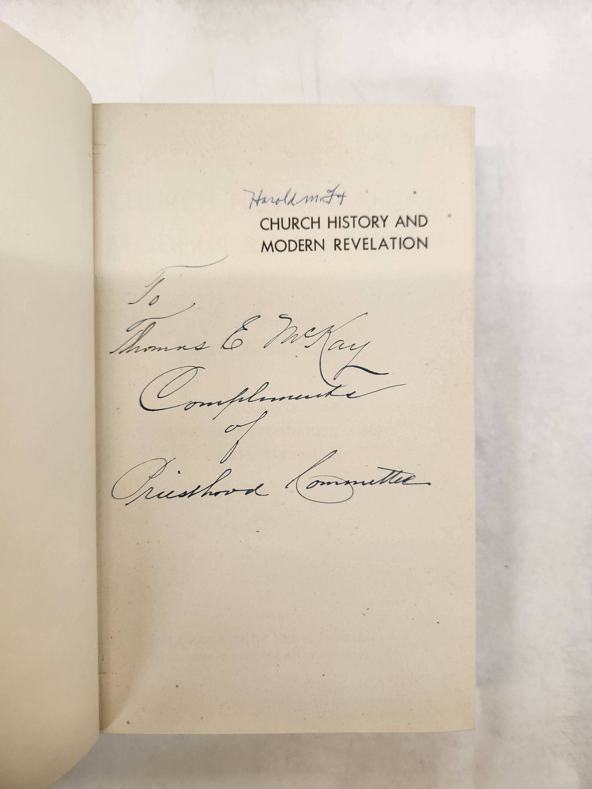 Church History and Modern Revelation (4 Volume Set Bound into One, Hardbound) This book was given to Thomas E. McKay from the Church Priesthood Committee. Brother McKay was called as an assistant to the Twelve Apostles under Heber J. Grant in 1941. He was the brother of President David O. McKay. Volumes cover the years of 1947, 1948, 1949, and 1950. There is an inscription on the first page, highlighting, and annotating throughout the book. Corners and edges show some shelf wear. Cover, front and back, has smudges and light scratch marks.