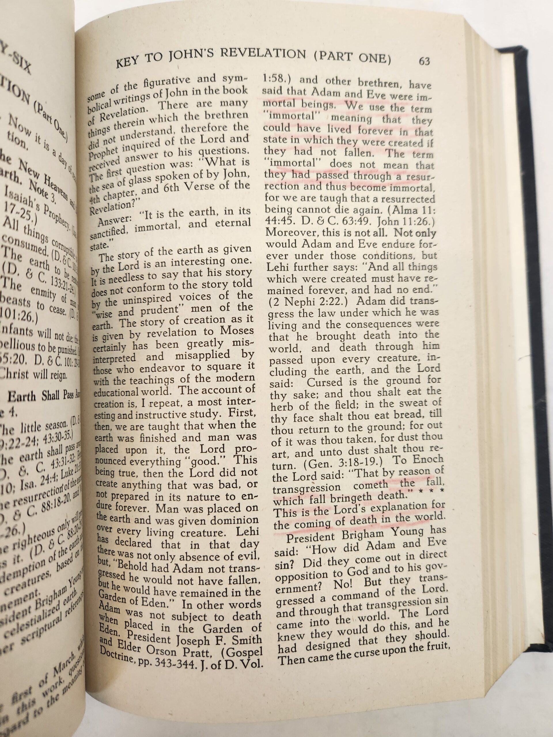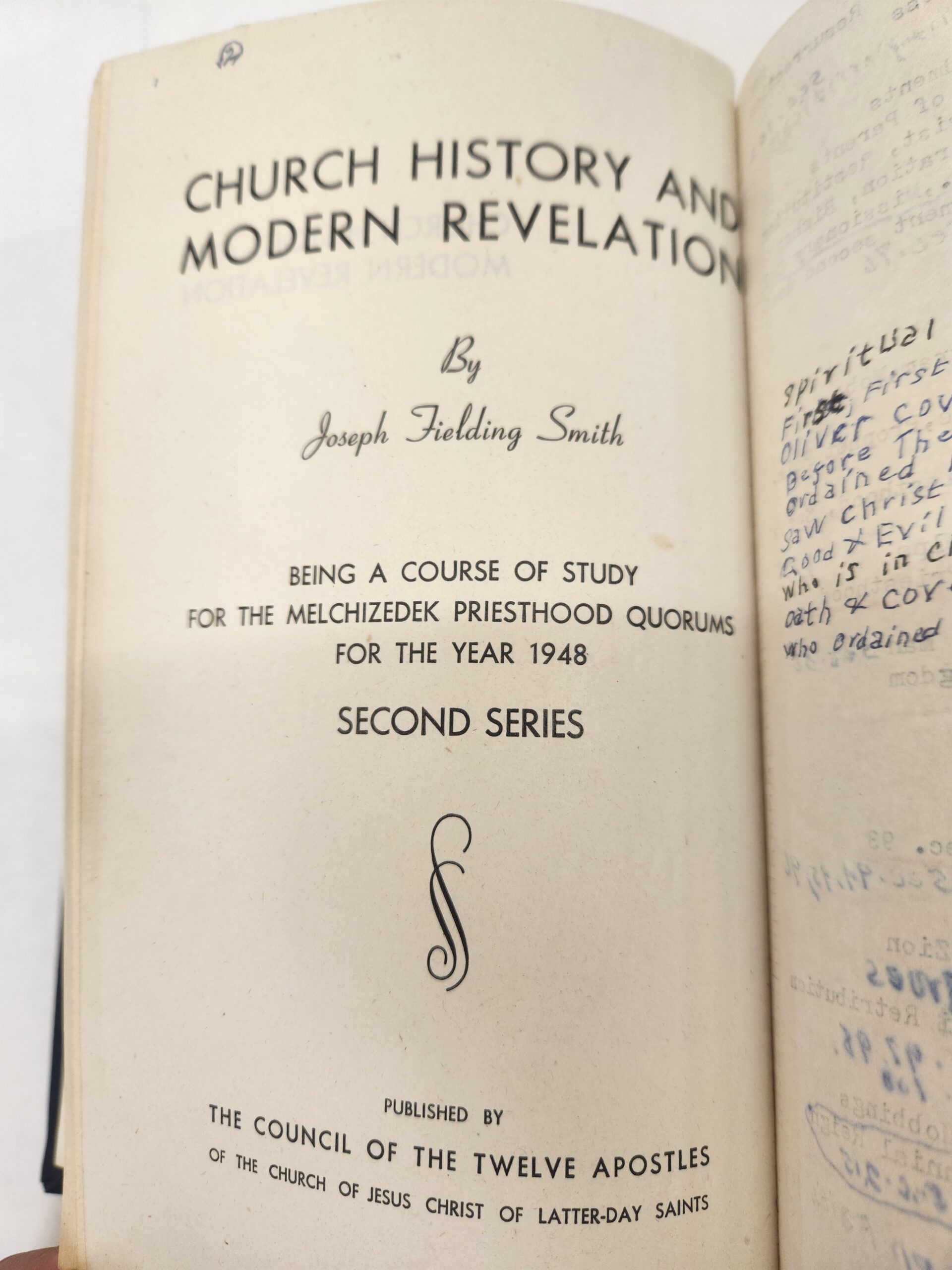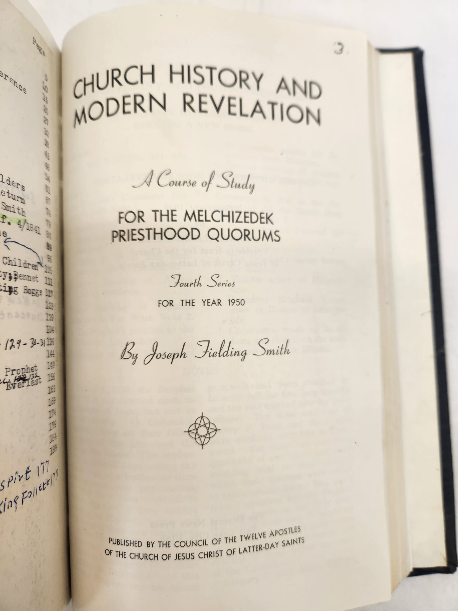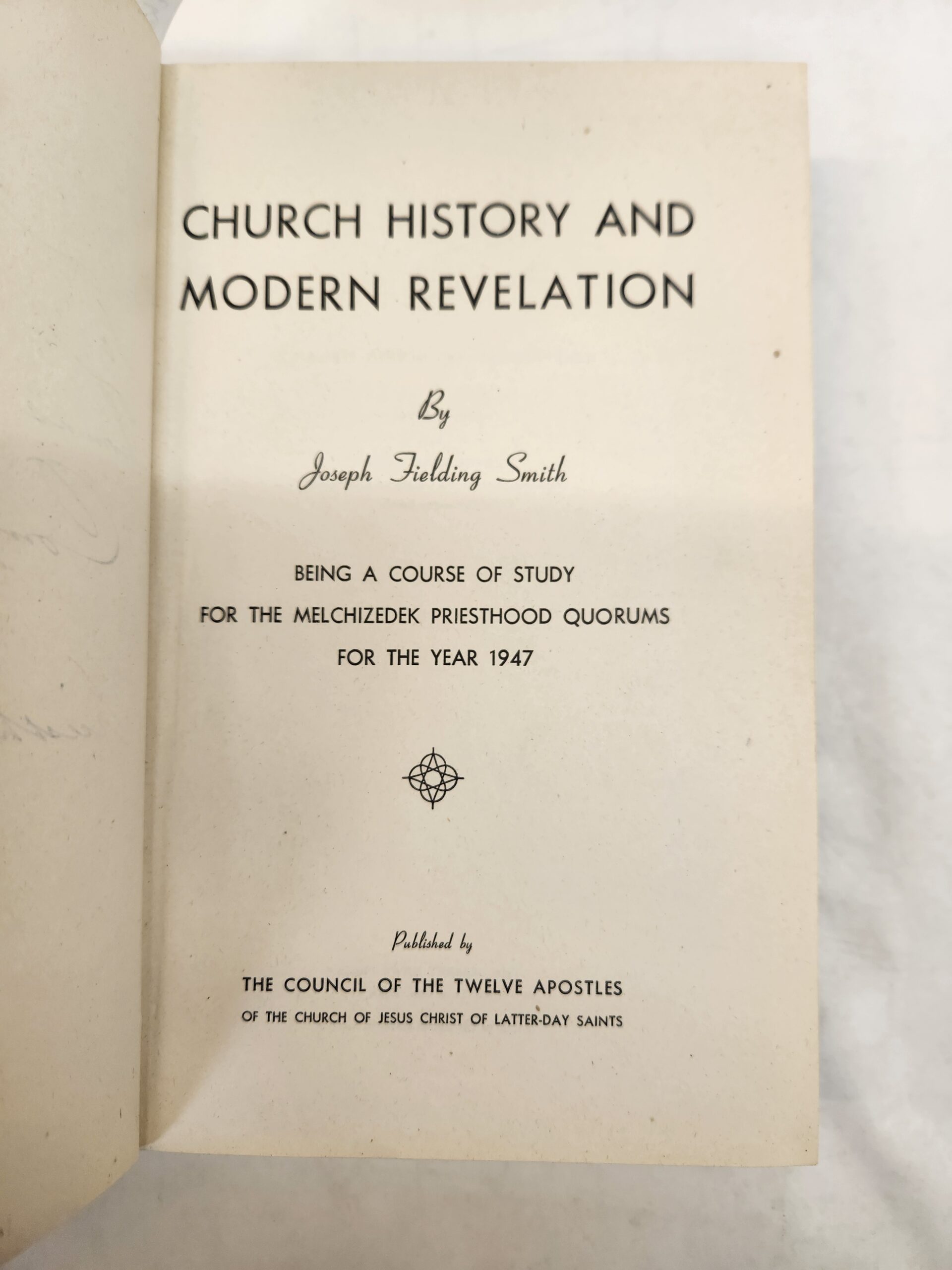 Church History and Modern Revelation (4 Volume Set Bound into One, Hardbound) This book was given to Thomas E. McKay from the Church Priesthood Committee. Brother McKay was called as an assistant to the Twelve Apostles under Heber J. Grant in 1941. He was the brother of President David O. McKay. Volumes cover the years of 1947, 1948, 1949, and 1950. There is an inscription on the first page, highlighting, and annotating throughout the book. Corners and edges show some shelf wear. Cover, front and back, has smudges and light scratch marks.