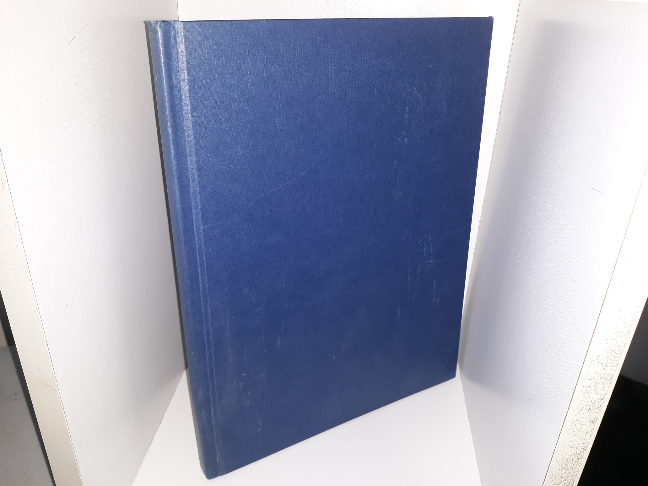Good condition, large, thin, blue hardcover with no dust jacket. The cover has scratches, scuff marks, and some corners are crushed. The front flyleaf has writing in pencil and eraser marks.
