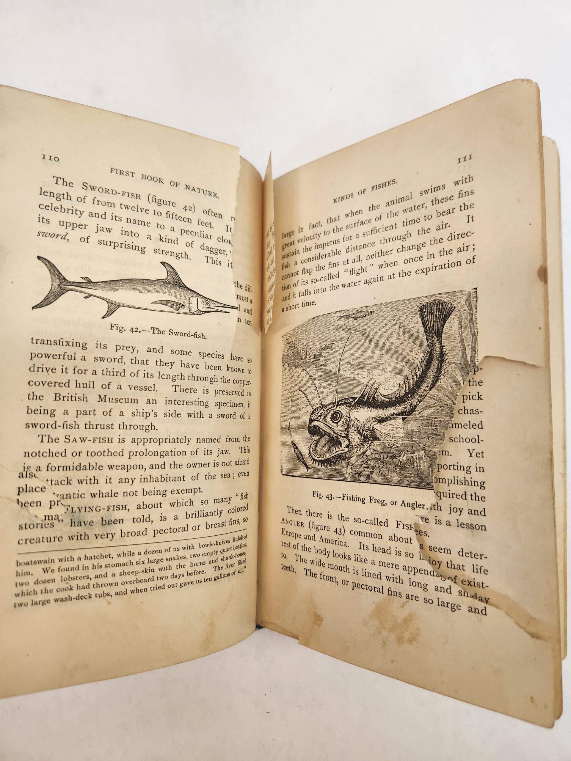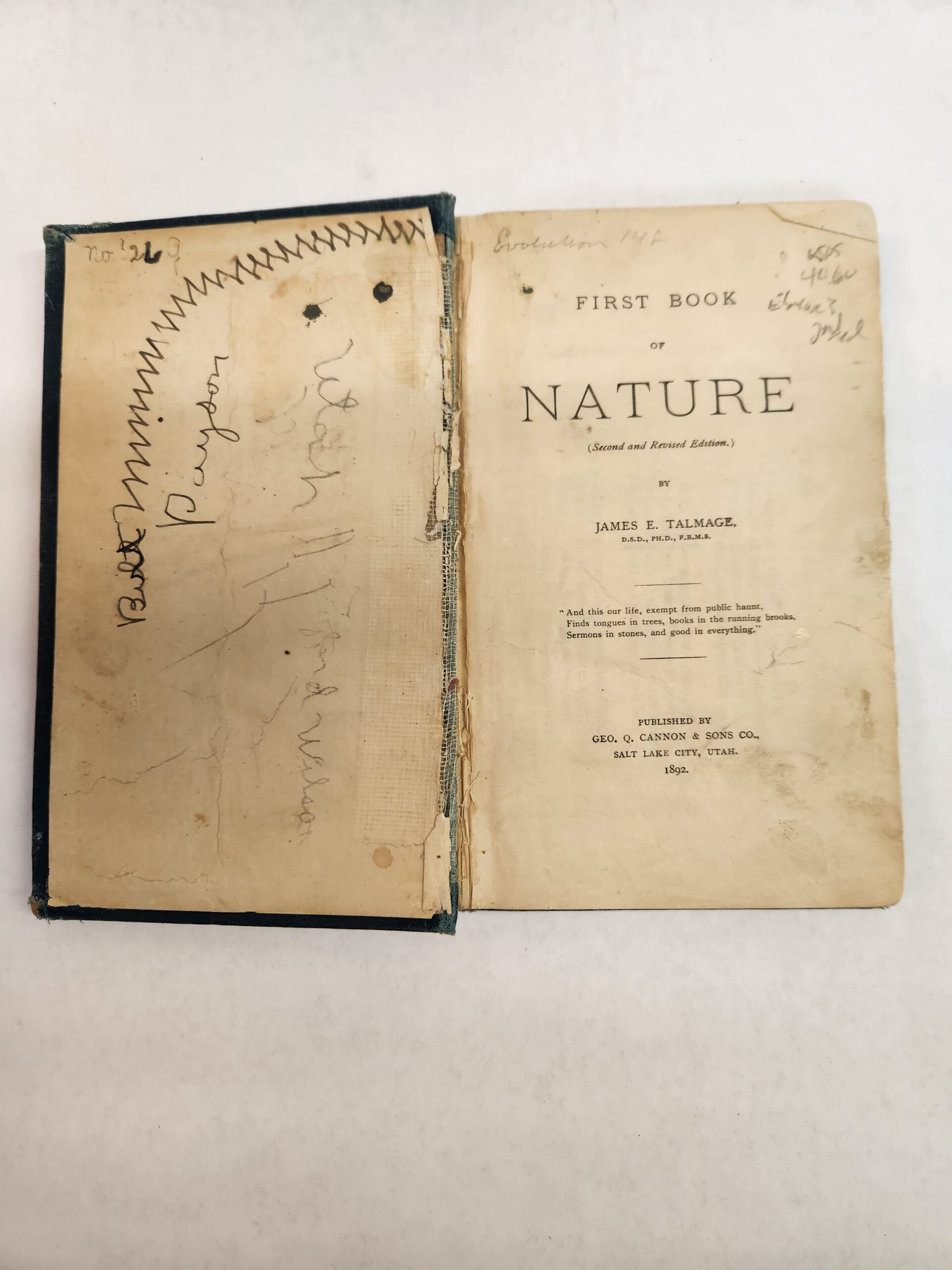 First Book of Nature (1892, 2nd Edition, Hardcover) There are some annotations written in pencil on the pages and a few pages have been torn (see examples of both in pictures in gallery). The inside of the front cover has writing in pen. The last few pages of the book are torn out. Also the binding is broken (see pic in gallery). Cover, front and back, shows wear with scuff marks, smudge marks, wrinkling, and scratch marks. Corners and edges show shelf wear with dents, bend marks, and small tears.