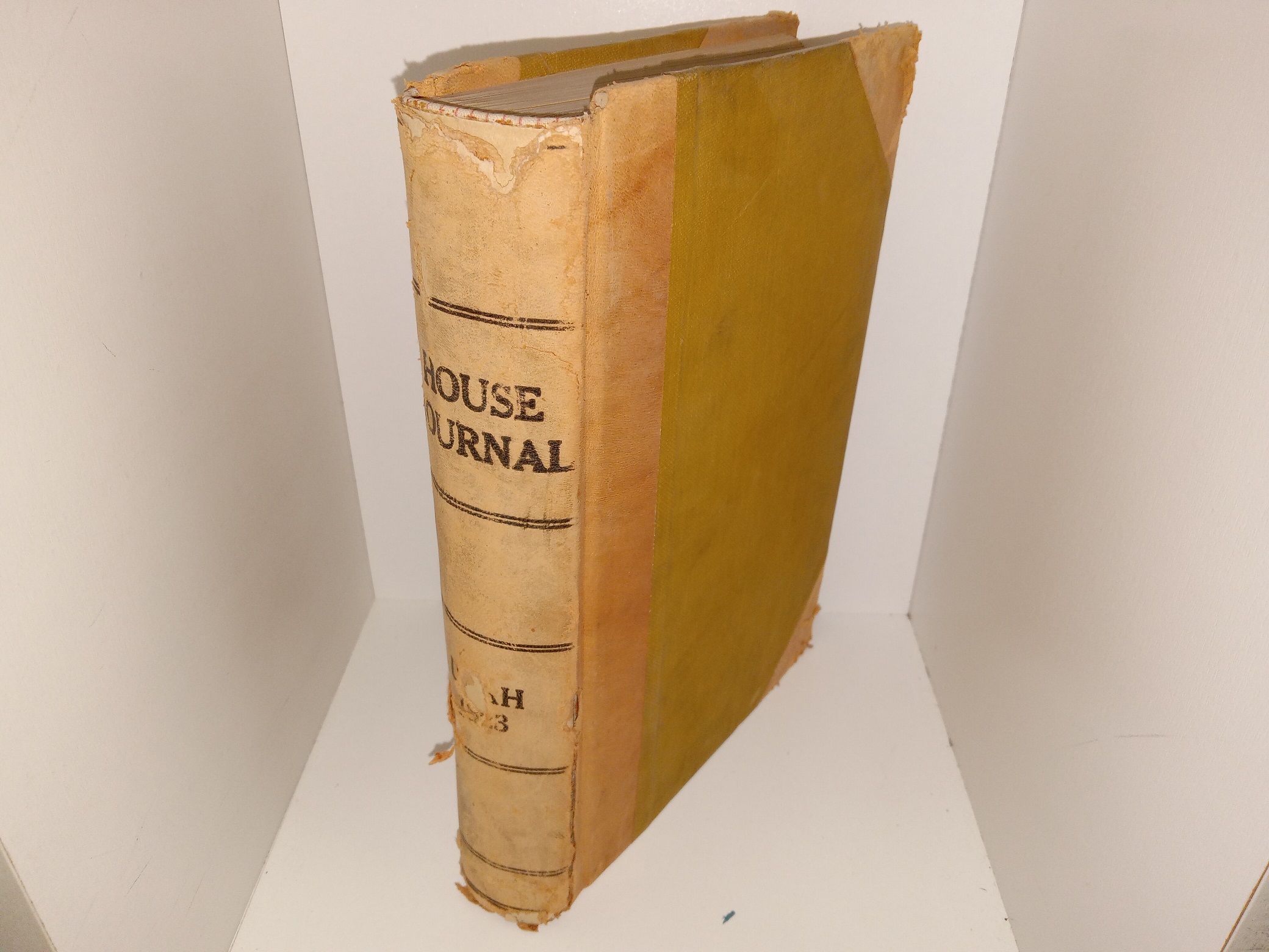 Fair condition, tan, 3/4 leather, hardcover book. The cover has stains, tears, peeling, scuffing, pieces torn off, crushed corners, and some fraying. The inside covers and flyleaves have ink stamps. Some pages have stains, but the text throughout is clear and legible. The front flyleaf has writing in pencil and eraser marks.
