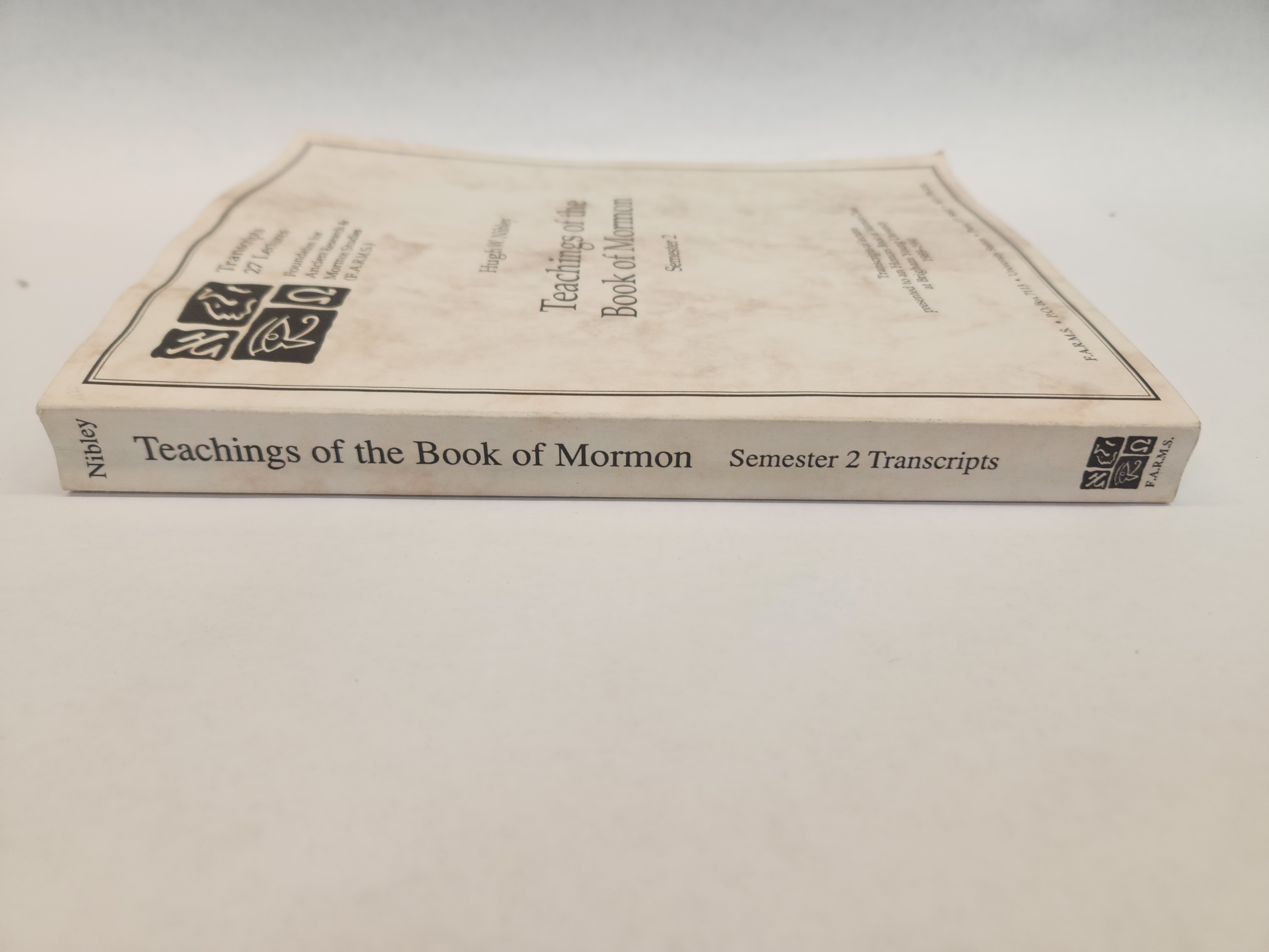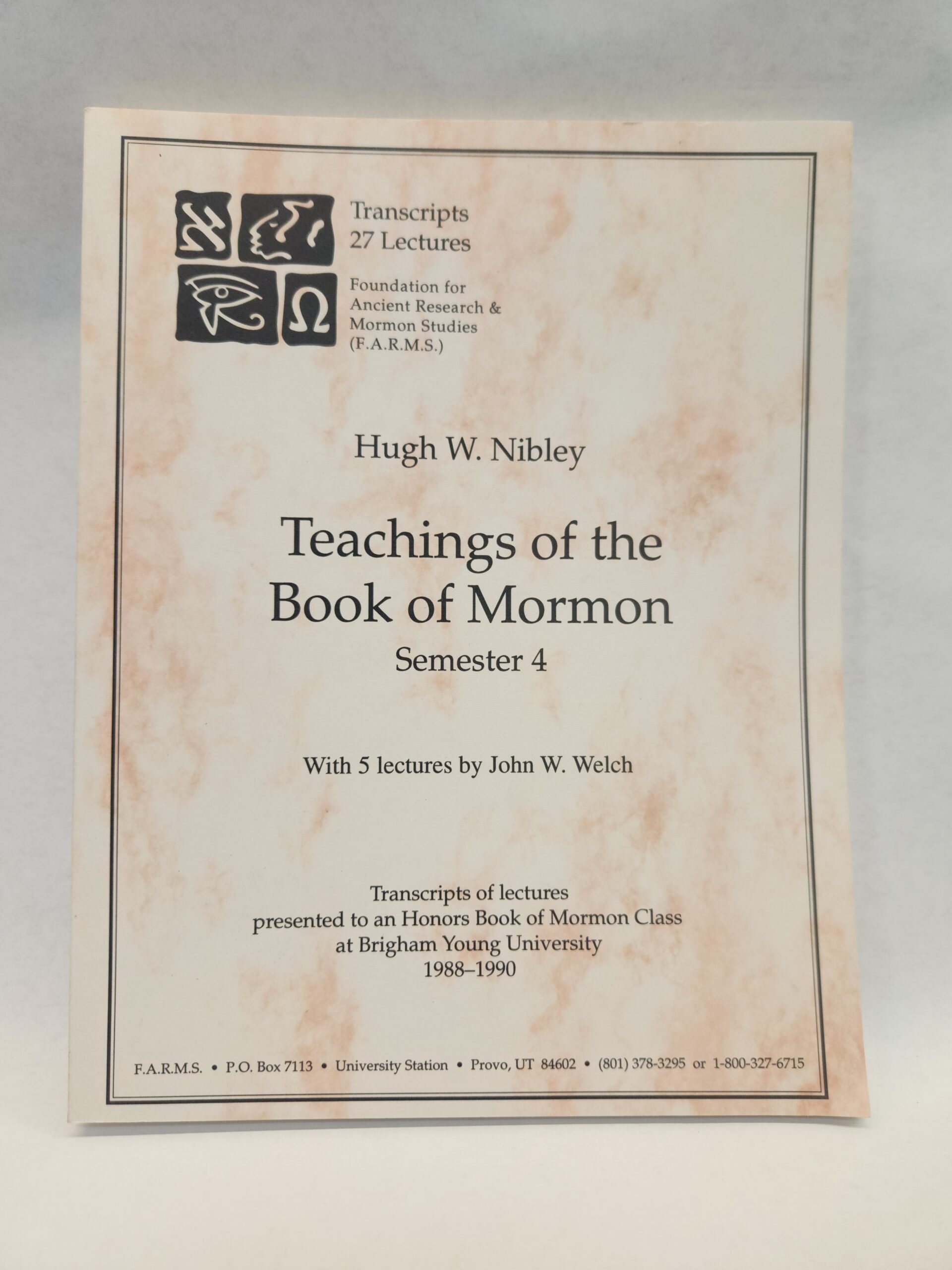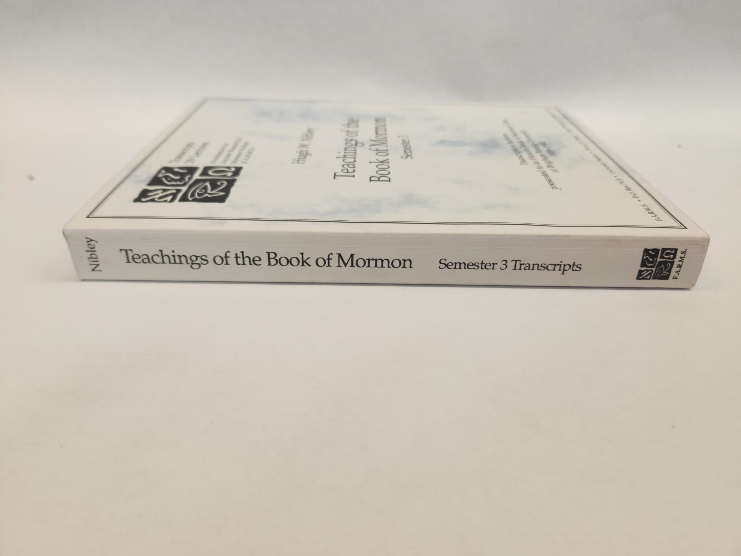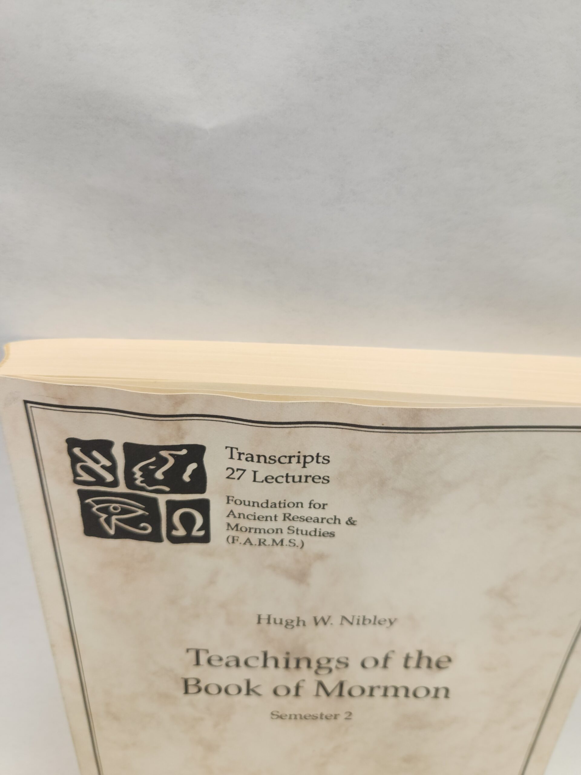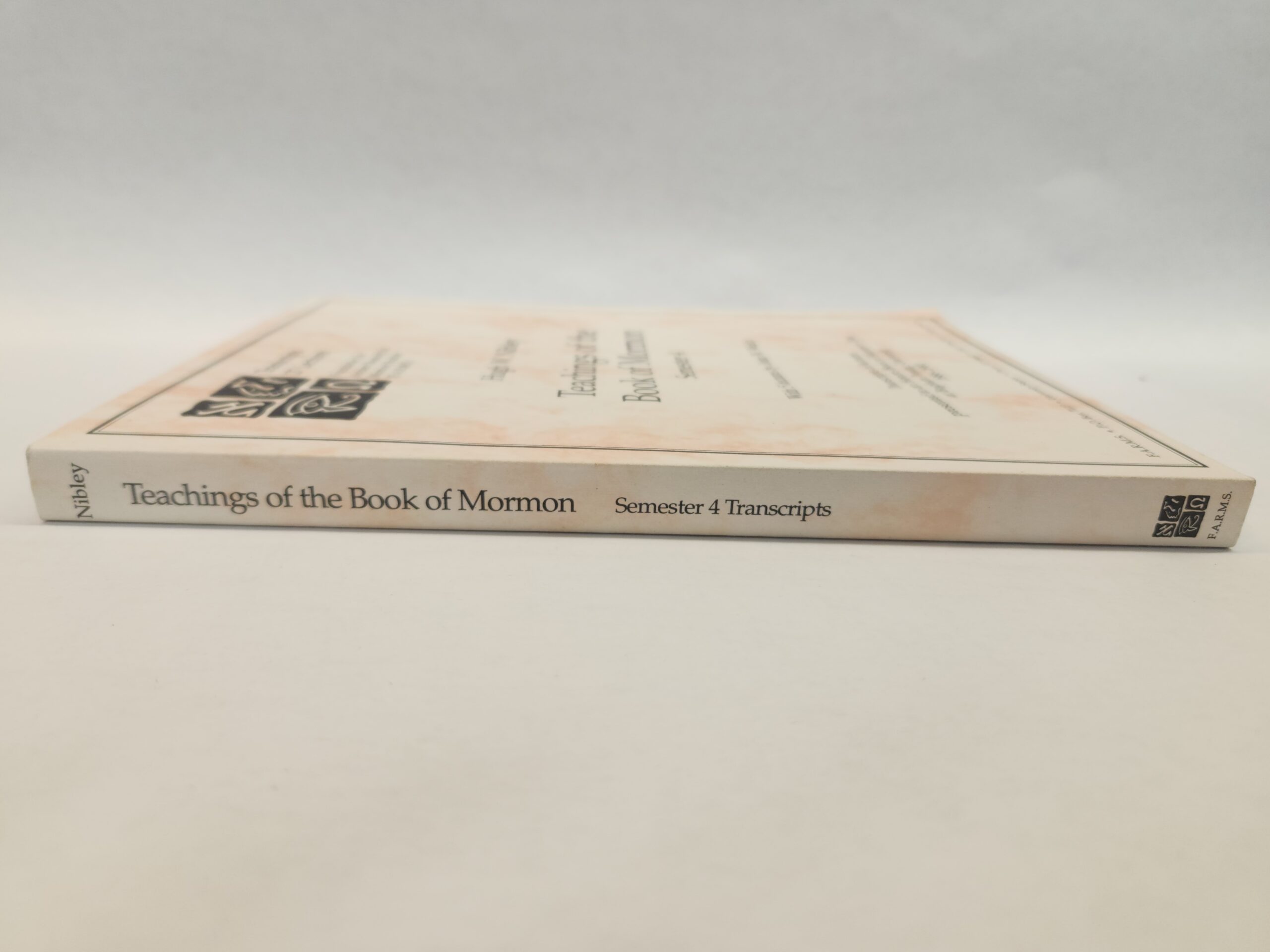 Hugh W. Nibley Teachings of the Book of Mormon:: Semester 1, Transcripts of lectures presented to an Honors Book of Mormon Class at Brigham Young University 1989-1990 (4 Volume set, Semesters 1 – 4, Paperback) Semester 1 book has no writing/marks on pages. Cover, front and back, has some red colored smudge marks and light scratch marks. Binding is good. Semester 2 book has some light/pale yellow highlighting throughout. Front cover has some warping to top (see pic in gallery). Binding is good. Semester 3 book has some highlighting throughout. There is a loose page (see pic in gallery). Back cover has some smudge marks. Semester 4 book has no marks/writing on pages. Binding is good. A selling sticker on back cover. All books corners/edges show some shelf wear with dents, light scuffs, and light bend marks (see pics in gallery).