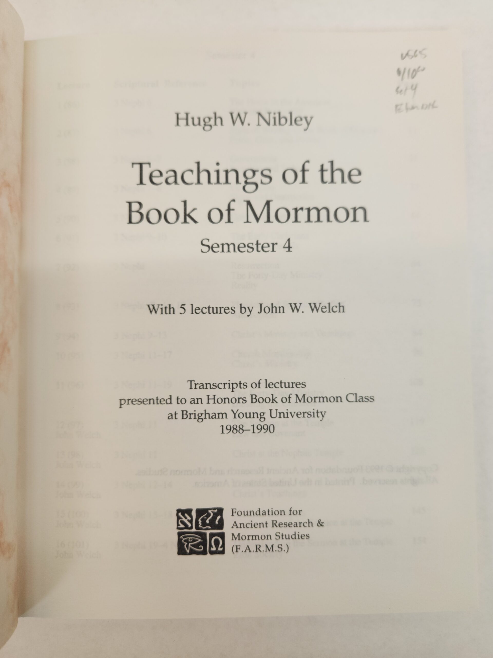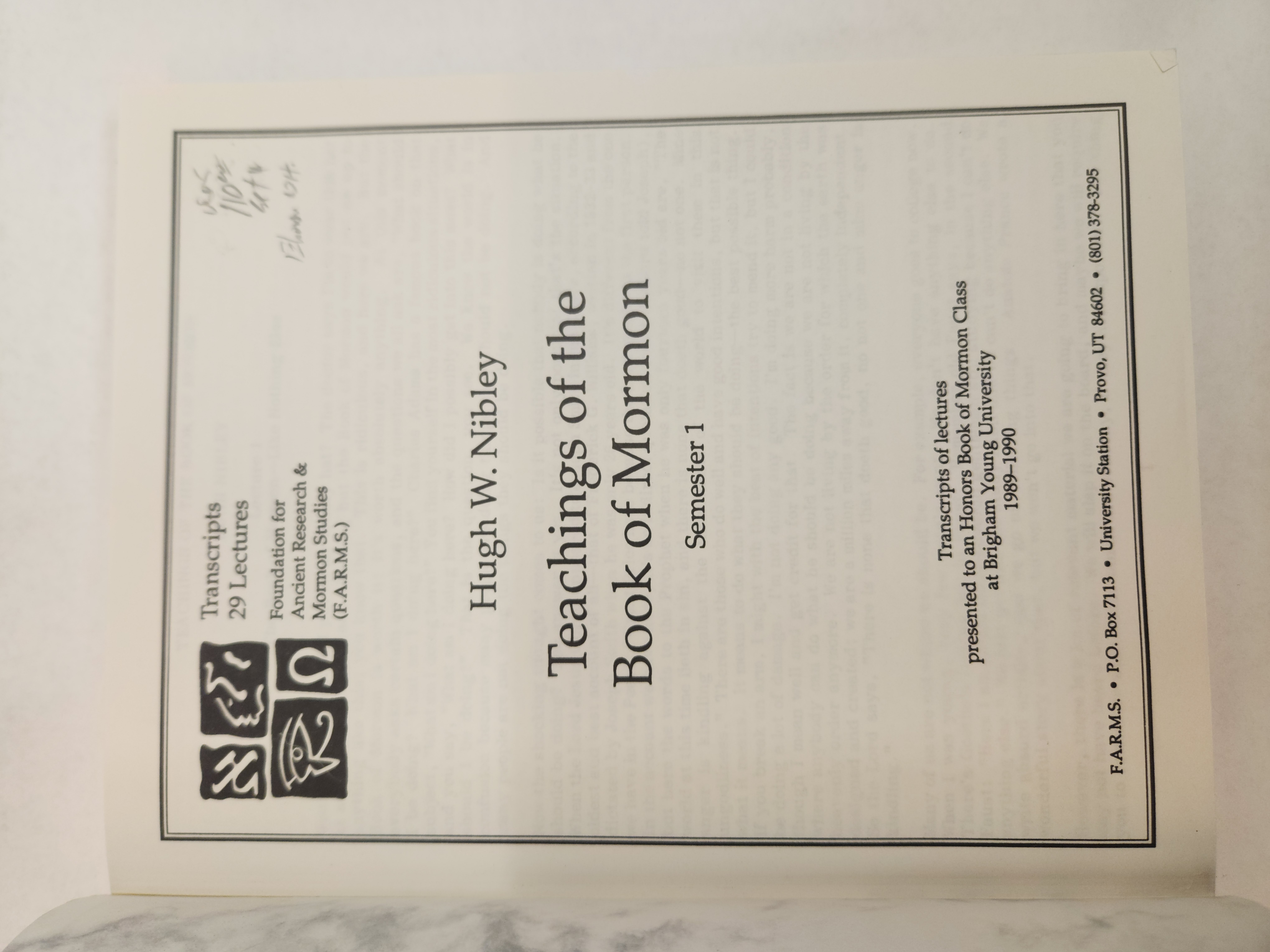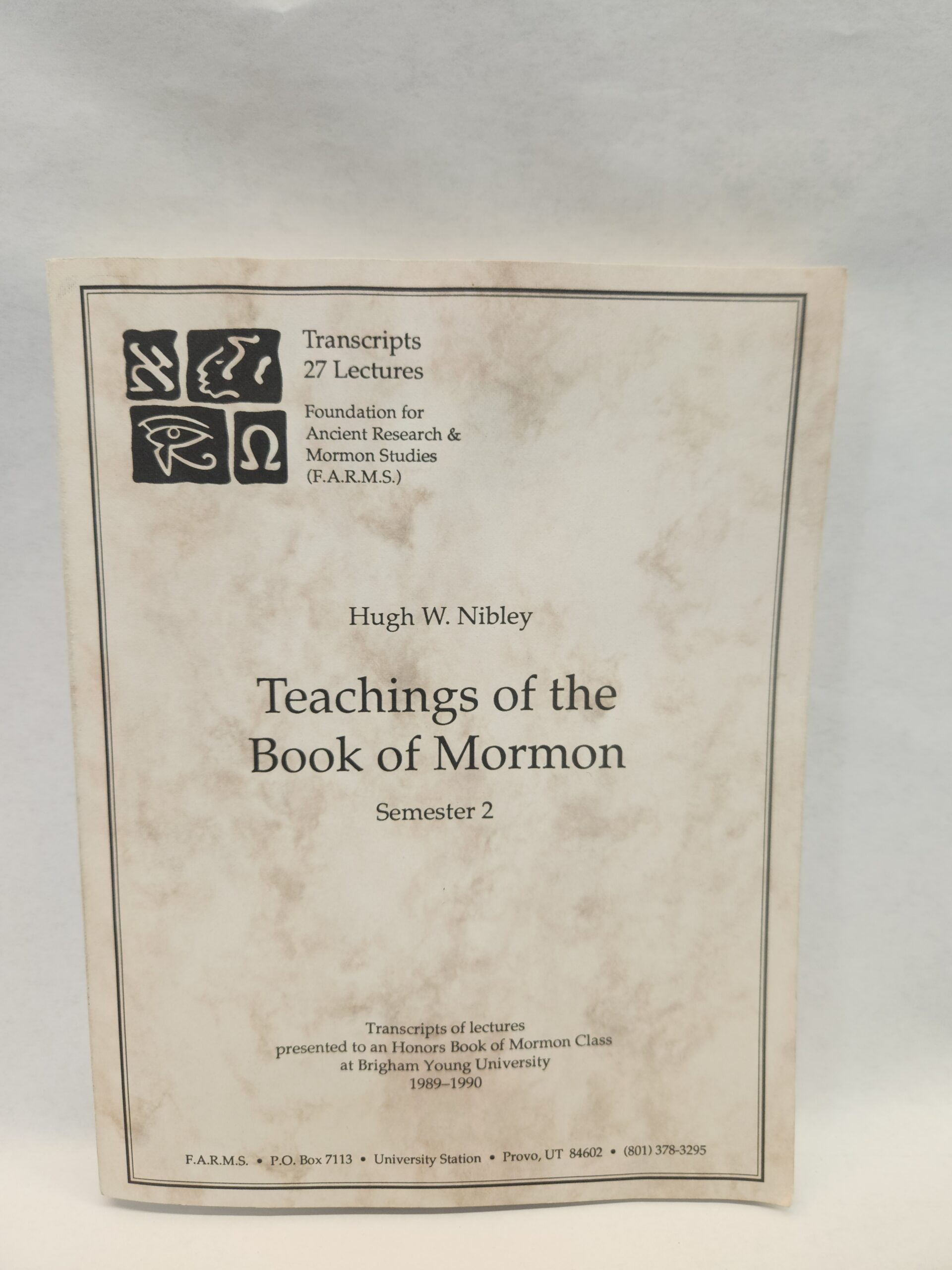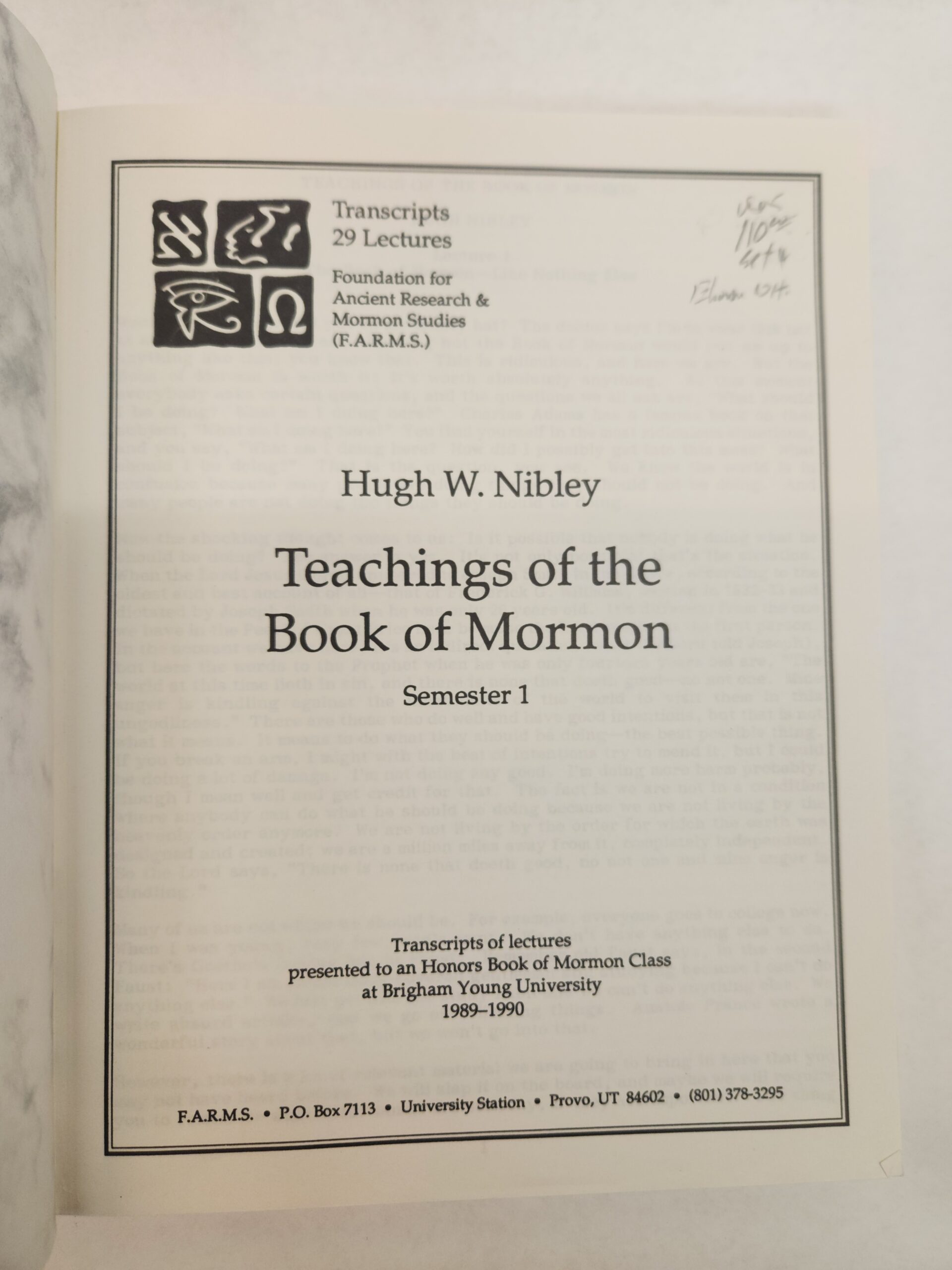 Hugh W. Nibley Teachings of the Book of Mormon:: Semester 1, Transcripts of lectures presented to an Honors Book of Mormon Class at Brigham Young University 1989-1990 (4 Volume set, Semesters 1 – 4, Paperback) Semester 1 book has no writing/marks on pages. Cover, front and back, has some red colored smudge marks and light scratch marks. Binding is good. Semester 2 book has some light/pale yellow highlighting throughout. Front cover has some warping to top (see pic in gallery). Binding is good. Semester 3 book has some highlighting throughout. There is a loose page (see pic in gallery). Back cover has some smudge marks. Semester 4 book has no marks/writing on pages. Binding is good. A selling sticker on back cover. All books corners/edges show some shelf wear with dents, light scuffs, and light bend marks (see pics in gallery).
