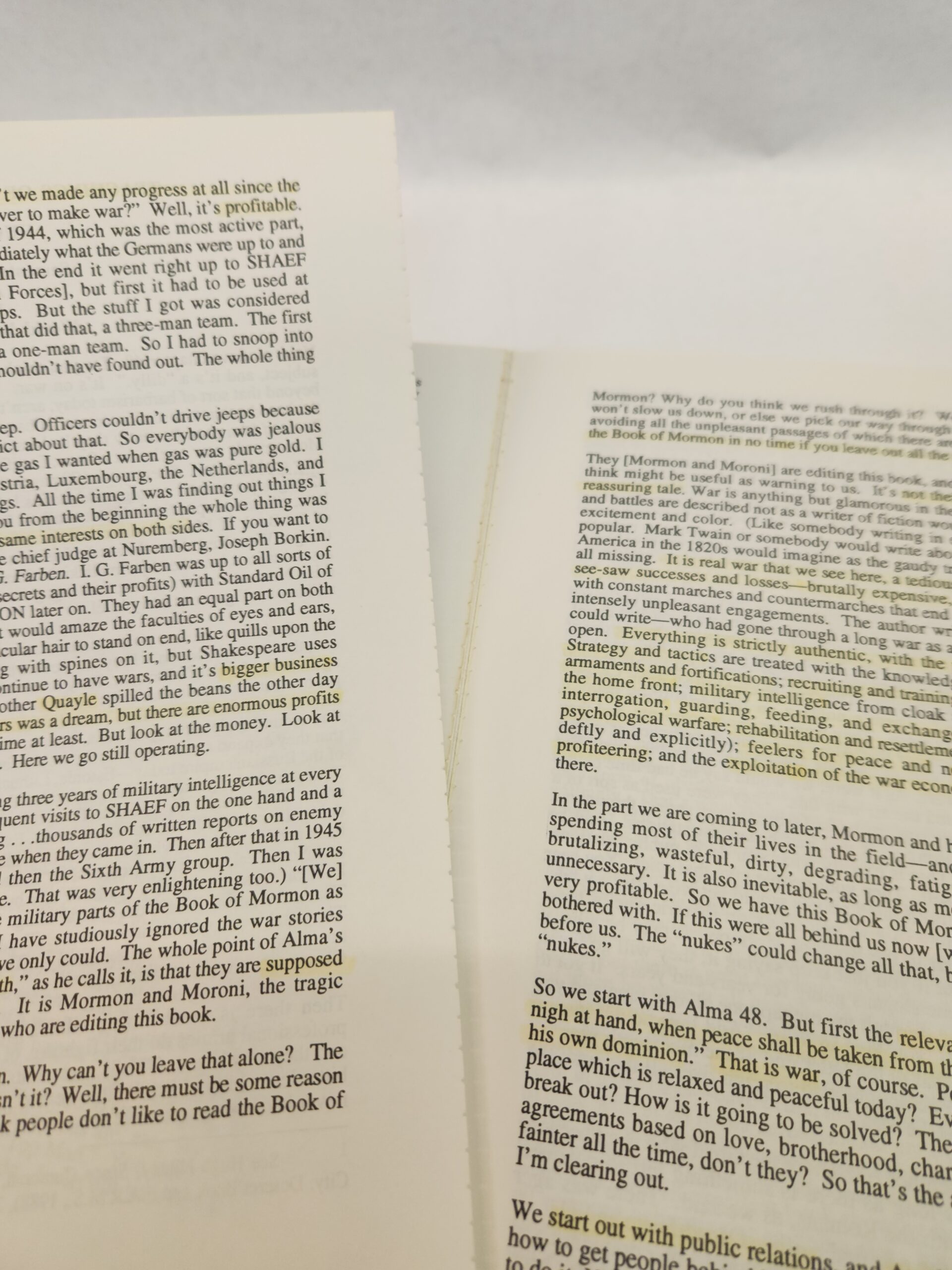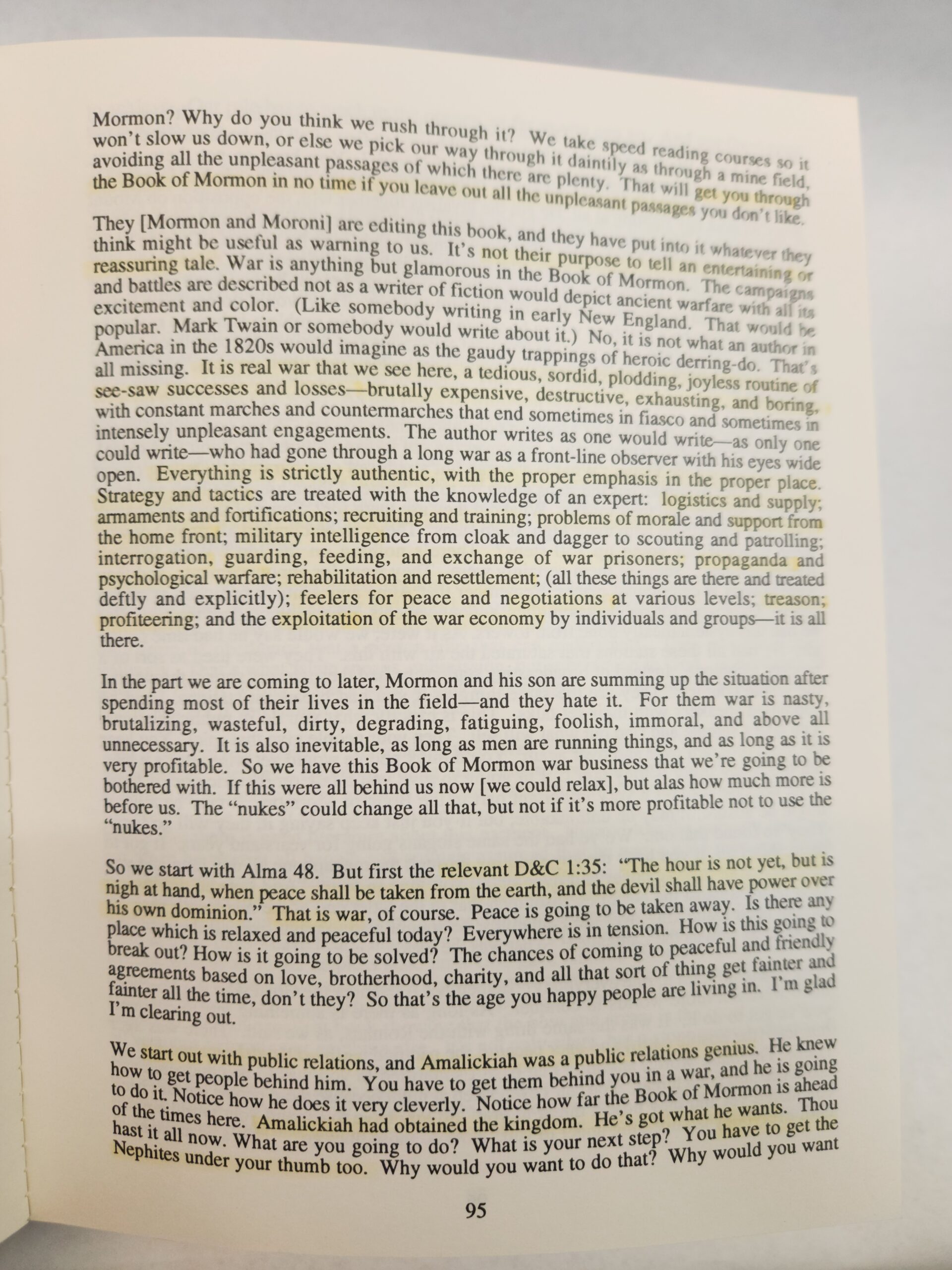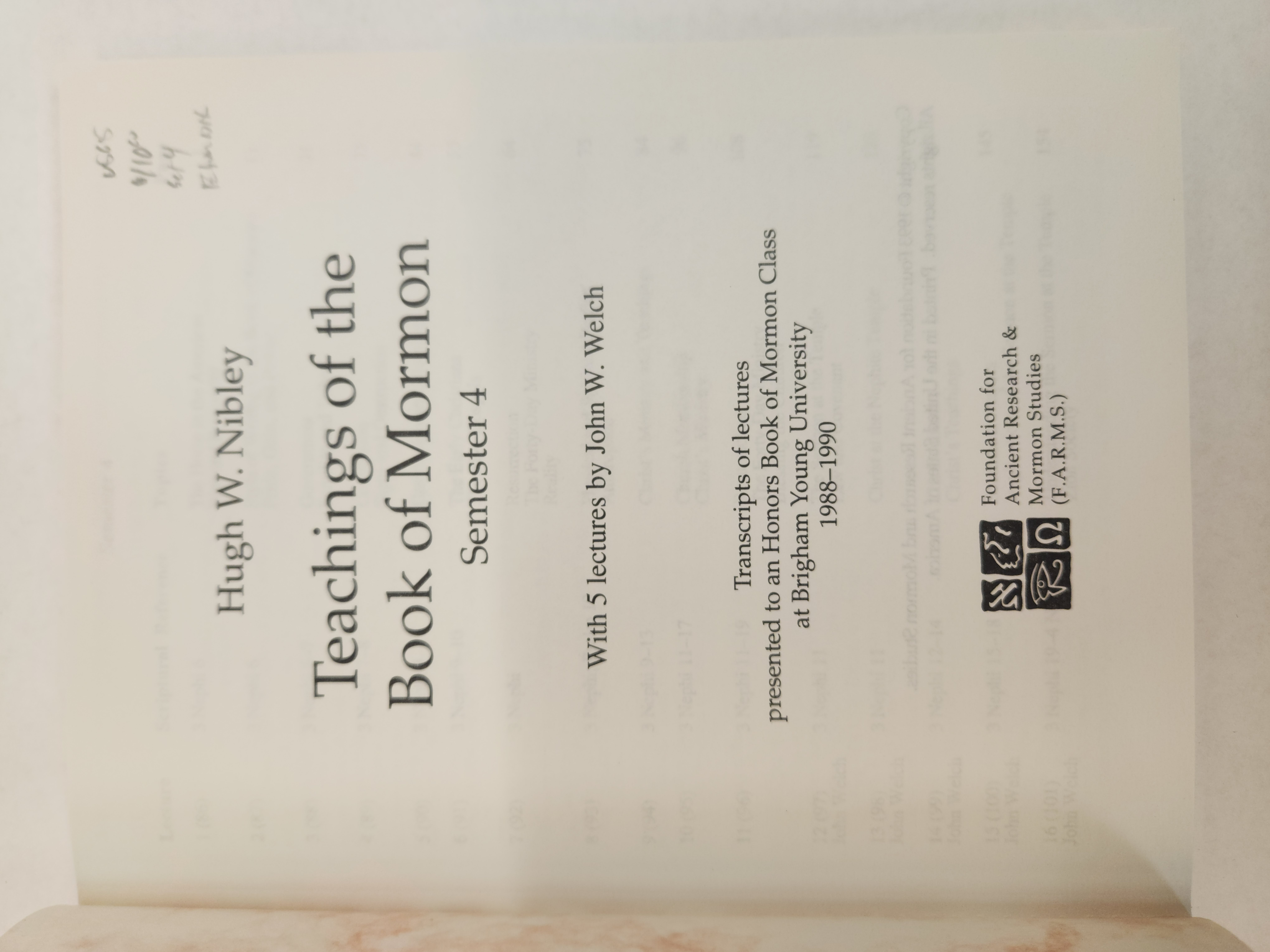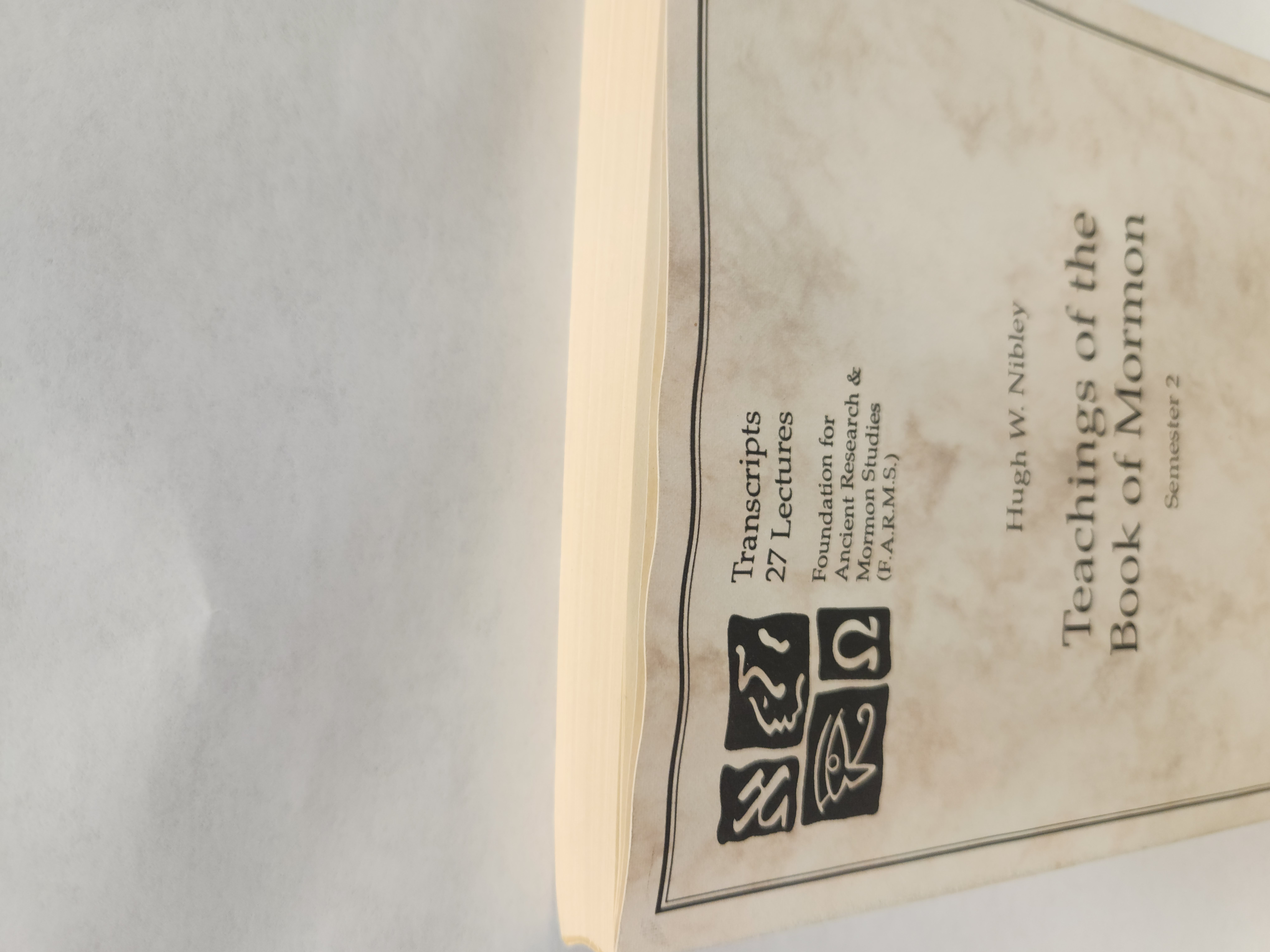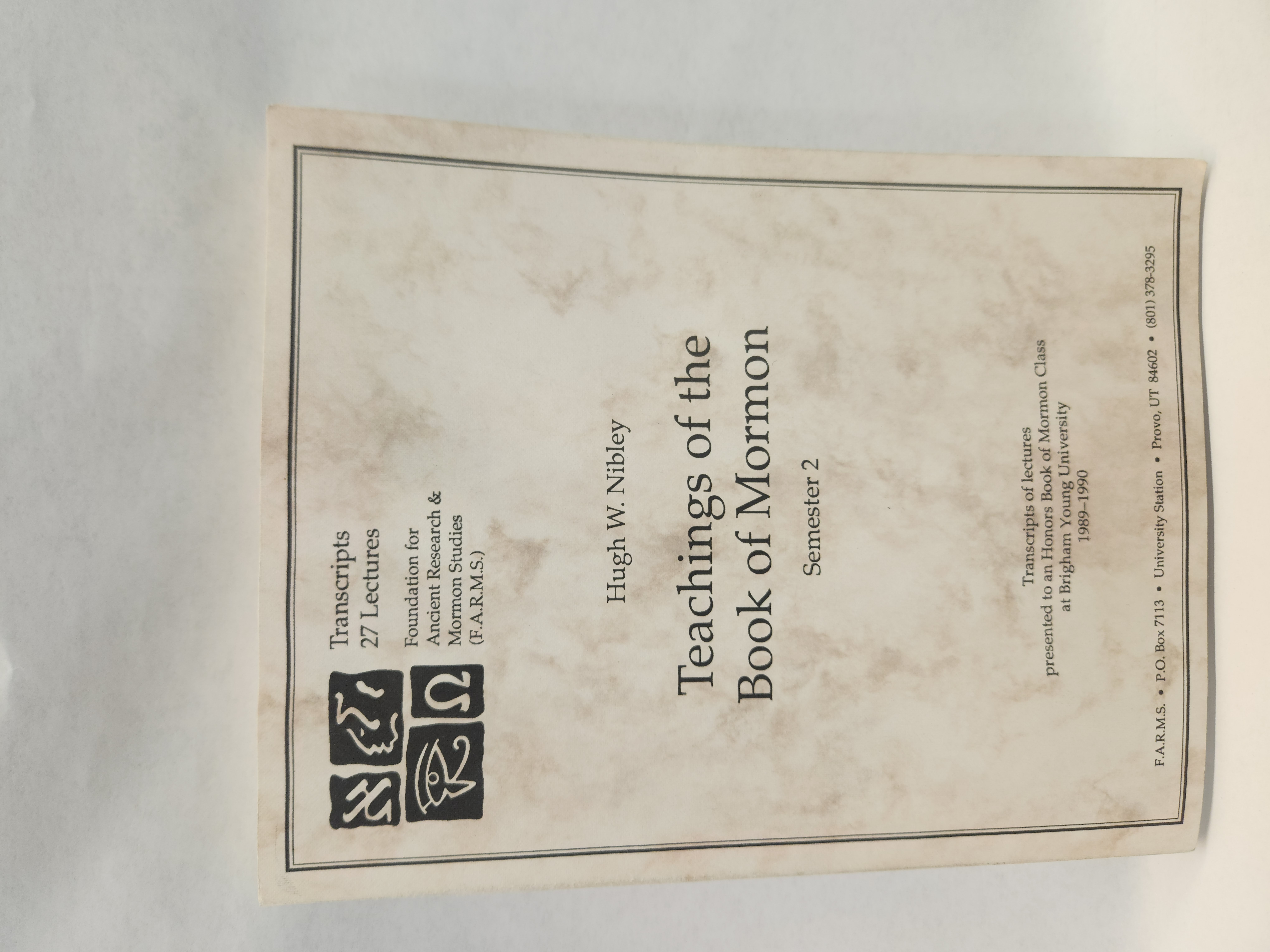 Hugh W. Nibley Teachings of the Book of Mormon:: Semester 1, Transcripts of lectures presented to an Honors Book of Mormon Class at Brigham Young University 1989-1990 (4 Volume set, Semesters 1 – 4, Paperback) Semester 1 book has no writing/marks on pages. Cover, front and back, has some red colored smudge marks and light scratch marks. Binding is good. Semester 2 book has some light/pale yellow highlighting throughout. Front cover has some warping to top (see pic in gallery). Binding is good. Semester 3 book has some highlighting throughout. There is a loose page (see pic in gallery). Back cover has some smudge marks. Semester 4 book has no marks/writing on pages. Binding is good. A selling sticker on back cover. All books corners/edges show some shelf wear with dents, light scuffs, and light bend marks (see pics in gallery).