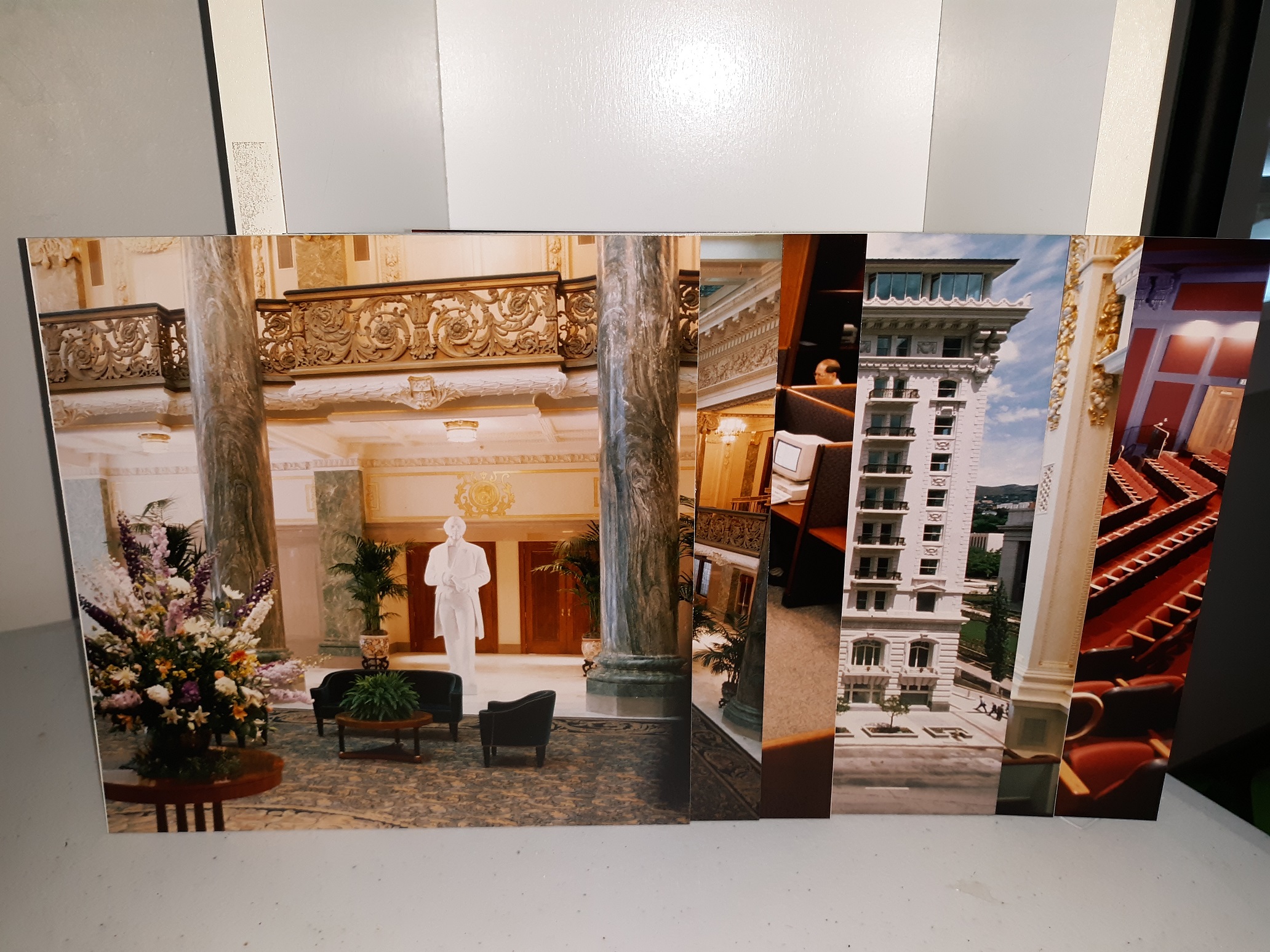 A good condition bundle including a booklet, photos, and a set of loose leaves, kept within their original, white folder. The folder has some creasing, wrinkles, some writing in pencil on the inside, and some wear at the corners and edges. The two booklet has no visible marks. The photographs are in great shape. The loose leaves are slightly wrinkled but otherwise in good condition.