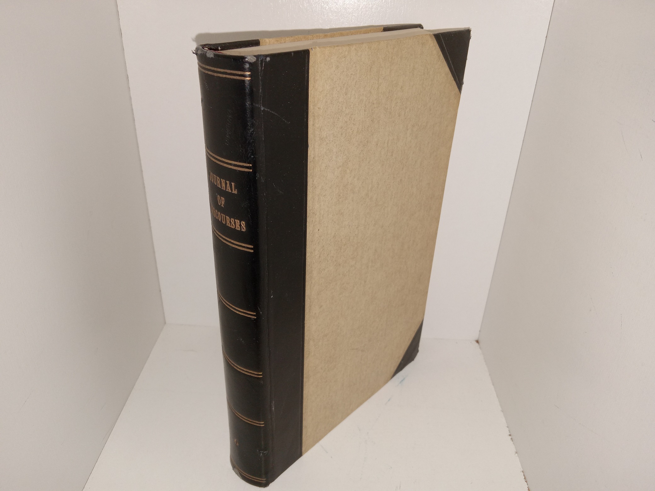 Fair condition, 3/4 leather book with a black spine, and no dust jacket. The cover has small tears, fraying and scuffing along the corners and edges. The front flyleaf has writing in pencil and eraser marks.