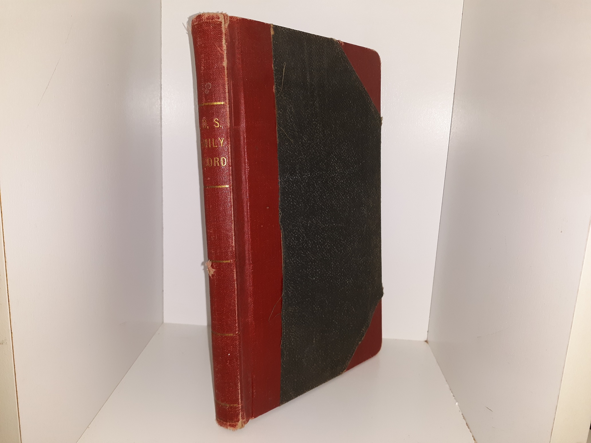 Fair condition hardcover with a red spine and no dust jacket. The cover has fading, wrinkles, scuff marks, fraying some tears, and the “leather is coming loose from the rest of the cover. The spine has a small piece torn off. The internal binding is torn. The inside covers and flyleaves have stains, wrinkles, writing in pen and writing in pencil. The last page was torn out and is missing. The first and second pages of spreadsheets’ have been filled in with pen by a previous owner.