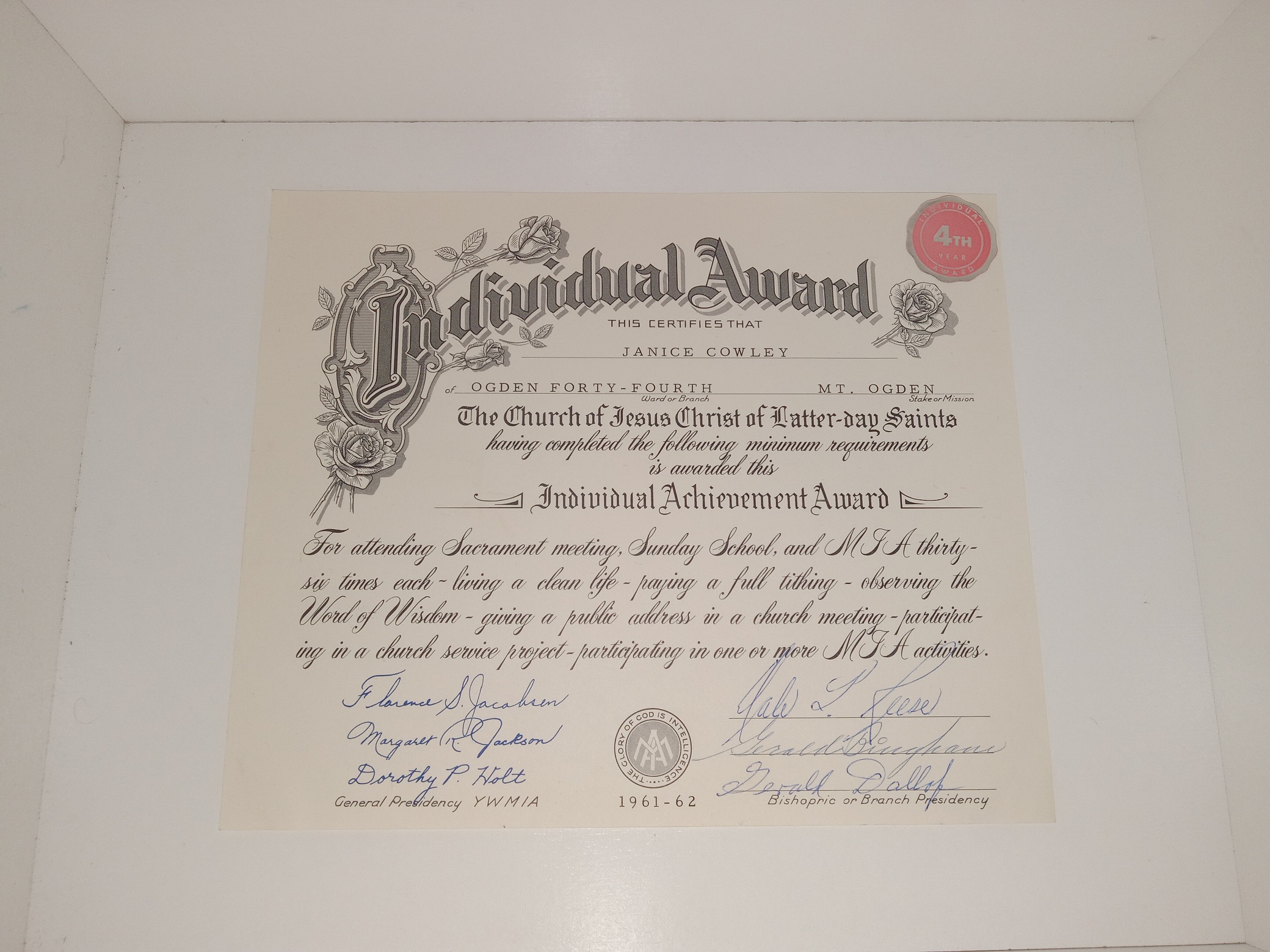 Good condition certificate that has been filled out in pen. The certificate has a couple dark marks on the back, and some minor wrinkling.