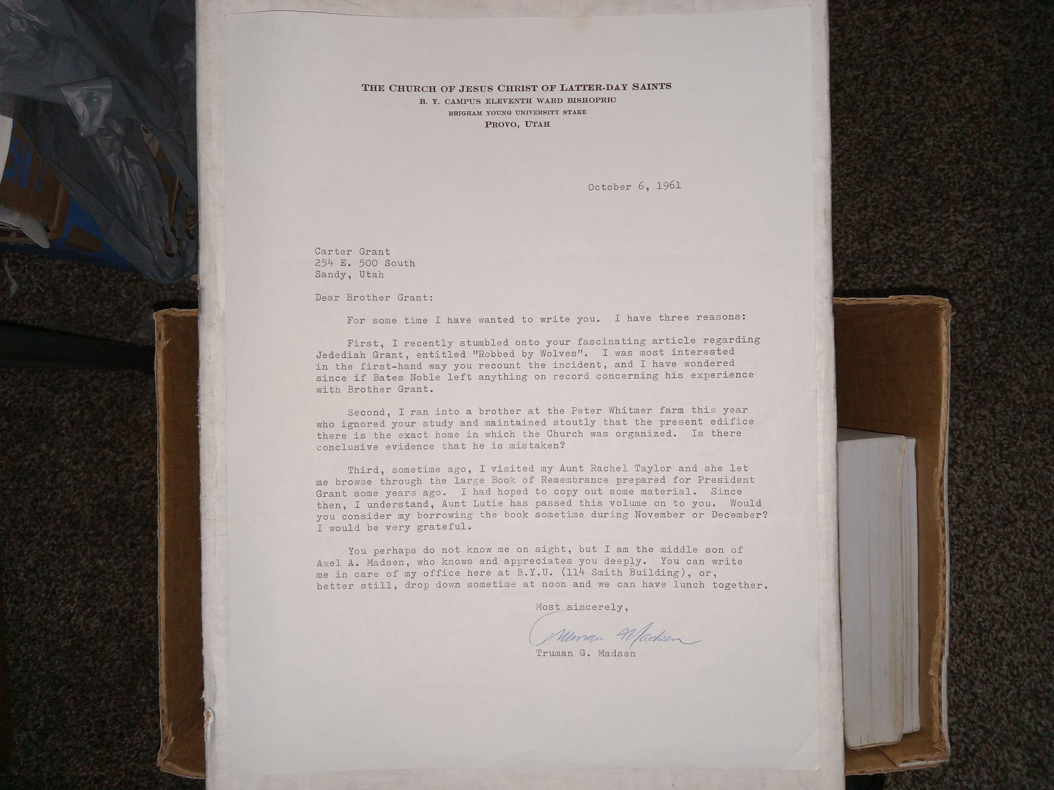 Letter to an LDS Author (Carter Grant) by Another LDS Author (Truman G. Madsen), Dated October 6, 1961