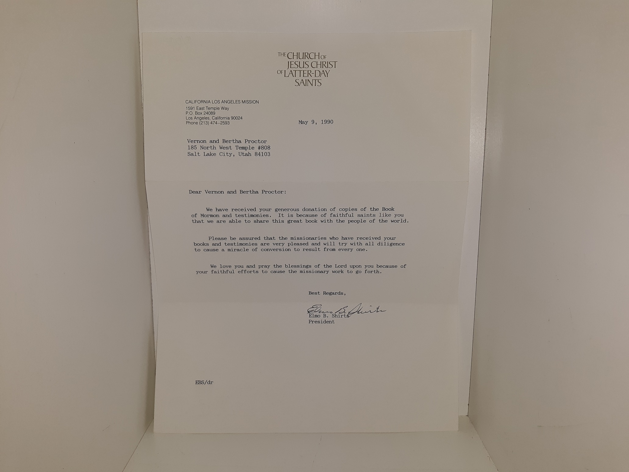 Letter to Vernon and Bertha Proctor Signed by President Elmo B. Shirts of the California Los Angeles Mission