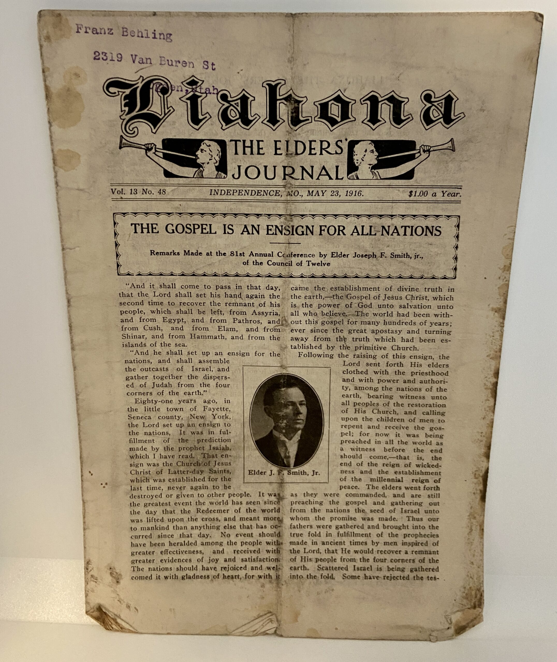 Poor condition staple bound pamphlet/magazine with signs of age. Bent/torn, stained Edges. Stains and discoloration on the covers. Address stamped on front cover. Clean text.