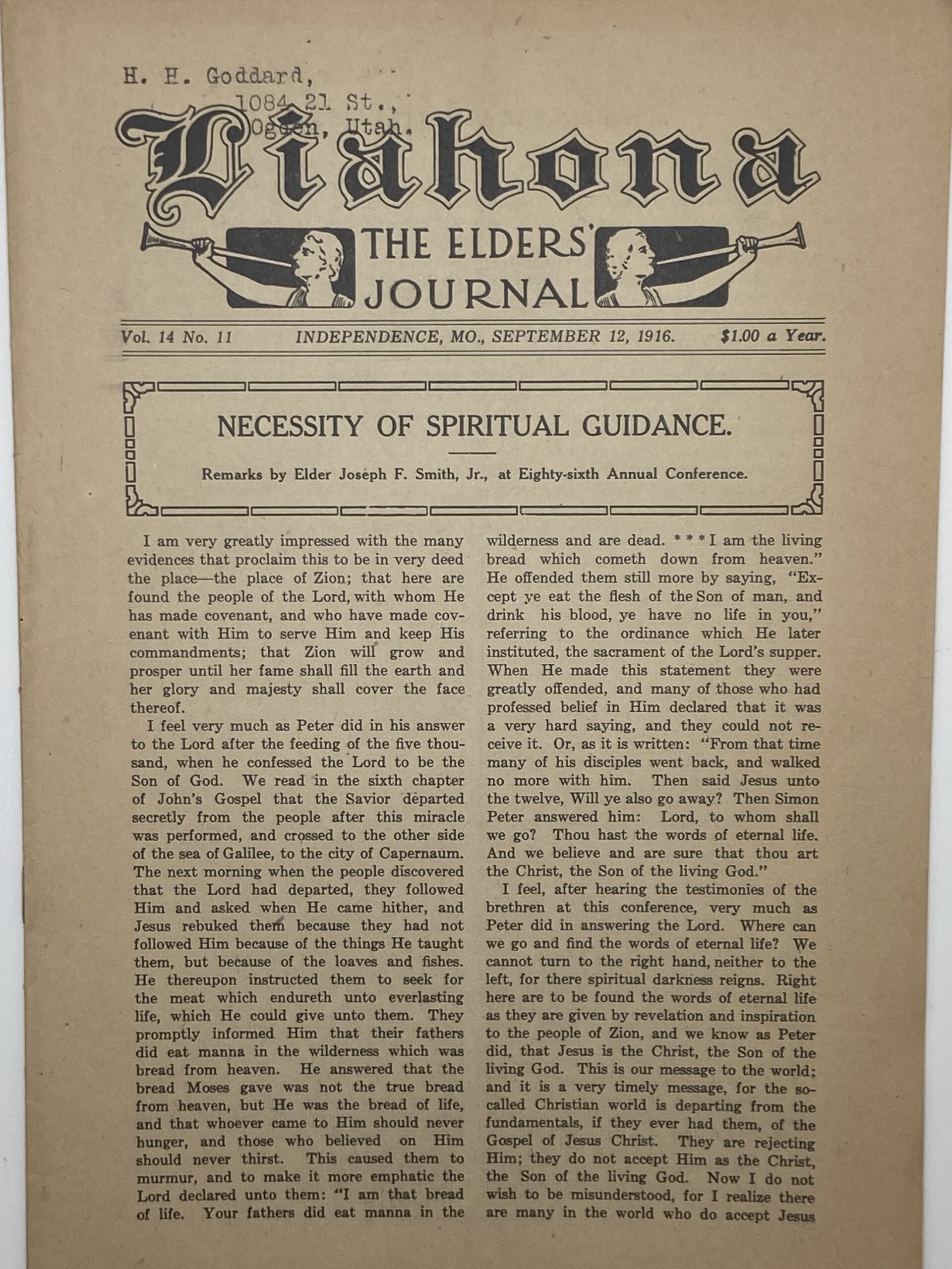 Fair condition staple bound pamphlet/magazine with signs of age. Bent/torn Edges. Stains and discoloration on the covers. Address stamped on front cover. Clean text.